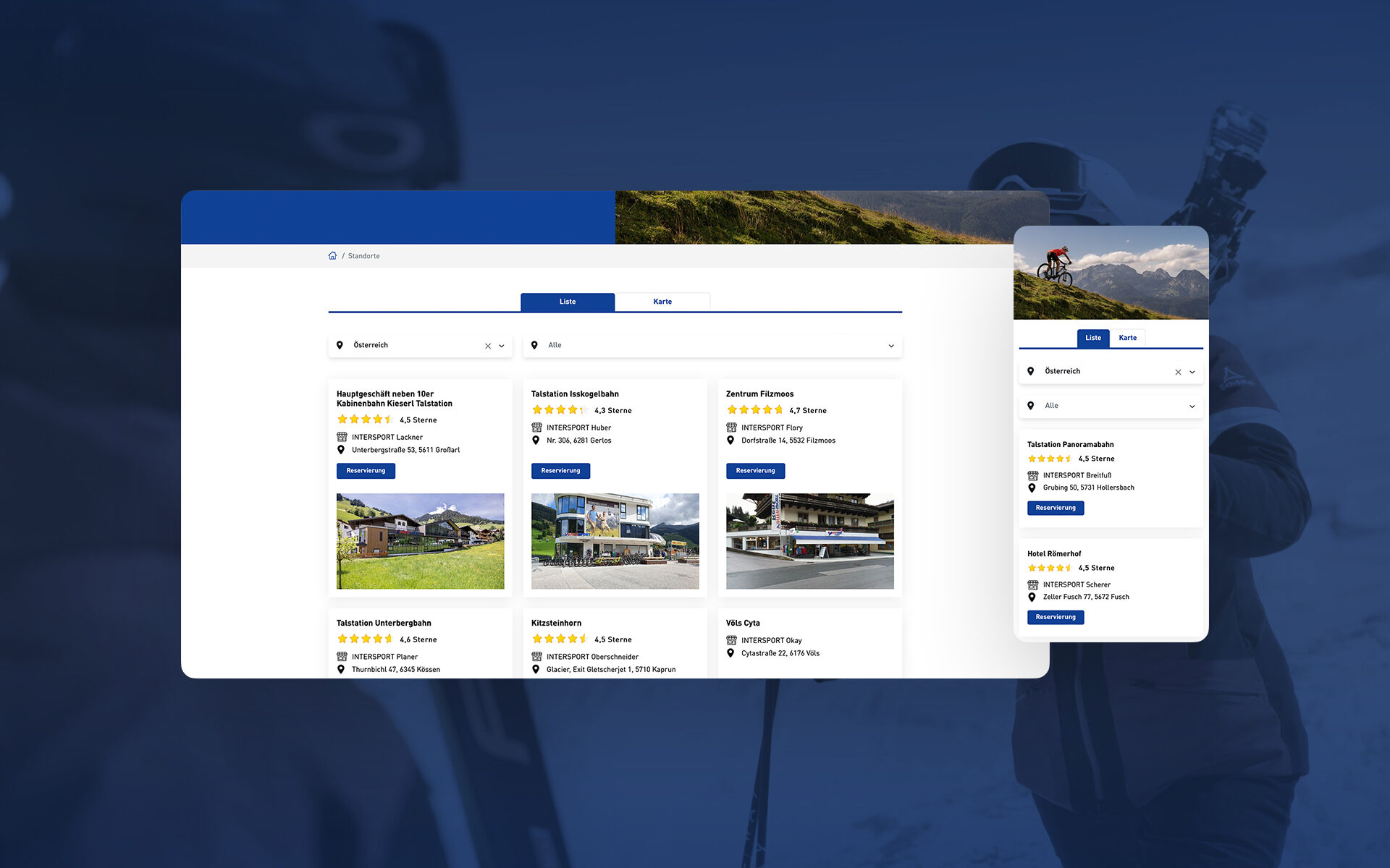 Die Suche nach dem nächstliegenden Standort ist bei einem flächendeckenden Händler-Netzwerk oft nicht einfach. Nach der Sucheingabe (Ort, Hotel, Region, Skigebiet, …) wird eine Gehzeitberechnung angezeigt und automatisch der passende Shop vorgeschlagen. Danach folgt die Zeitauswahl und Personenanzahl und schon kann aus einer Vielzahl von Produkten ausgewählt und die Reservierung online abgeschlossen werden.
