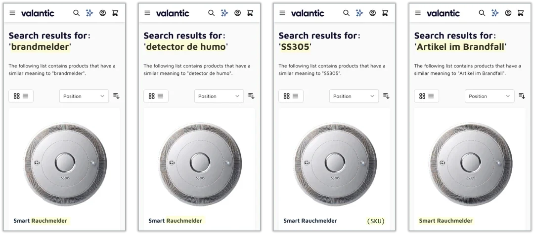 Intelligente Produktsuche im Onlineshop am Beispiel eines Rauchmelders: Unsere KI-basierte Suchtechnologie erkennt das passende Produkt, unabhängig davon, wie der Suchbegriff eingegeben wird. Ob in einer anderen Sprache, als Artikelnummer oder durch eine Umschreibung – die KI liefert zuverlässig das gewünschte Ergebnis.