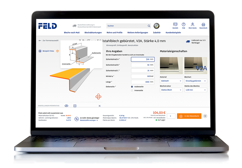Der Konfigurator für Blechabkantungen generiert die 3D-Vorschau nach Eingabe der verschiedenen Metallsorten, Maße und Wunschprofile. Der Konfigurator für individuelle Ausschnitte ermöglicht es den Kunden, verschiedene Ausstanzungen, Formen oder Nuten im gewählten Blech live zu setzen.