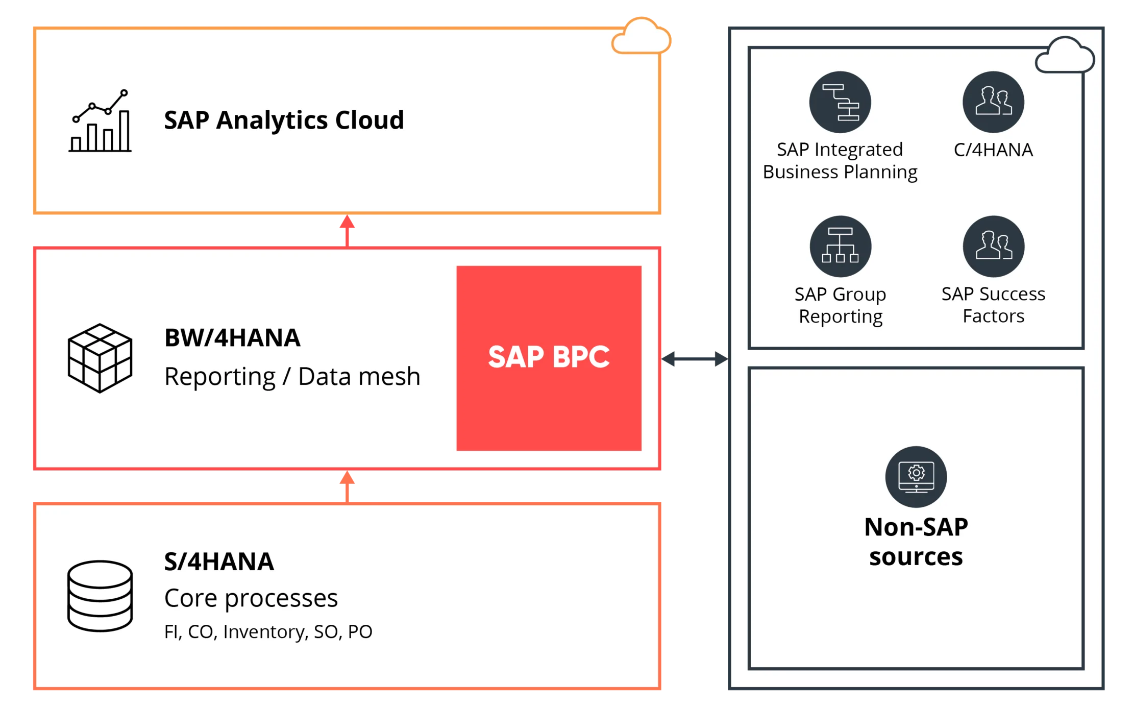 SAP BPC is part of the SAP Business Warehouse, and this is exactly what enables a single-point-of-truth (SPOT) approach. The characteristics of the SPOT approach can be summarized in the statement: “All the data you need in the right place and in the expected quality at the right time.” This means that the data needed for both reporting and planning can be collected, prepared and made available in the business warehouse. In addition to SAP sources such as SAP S/4HANA and SAP ECC, non-SAP sources can also be connected. This means that additional loading processes for reporting and comparison of plan and actual figures are superfluous.