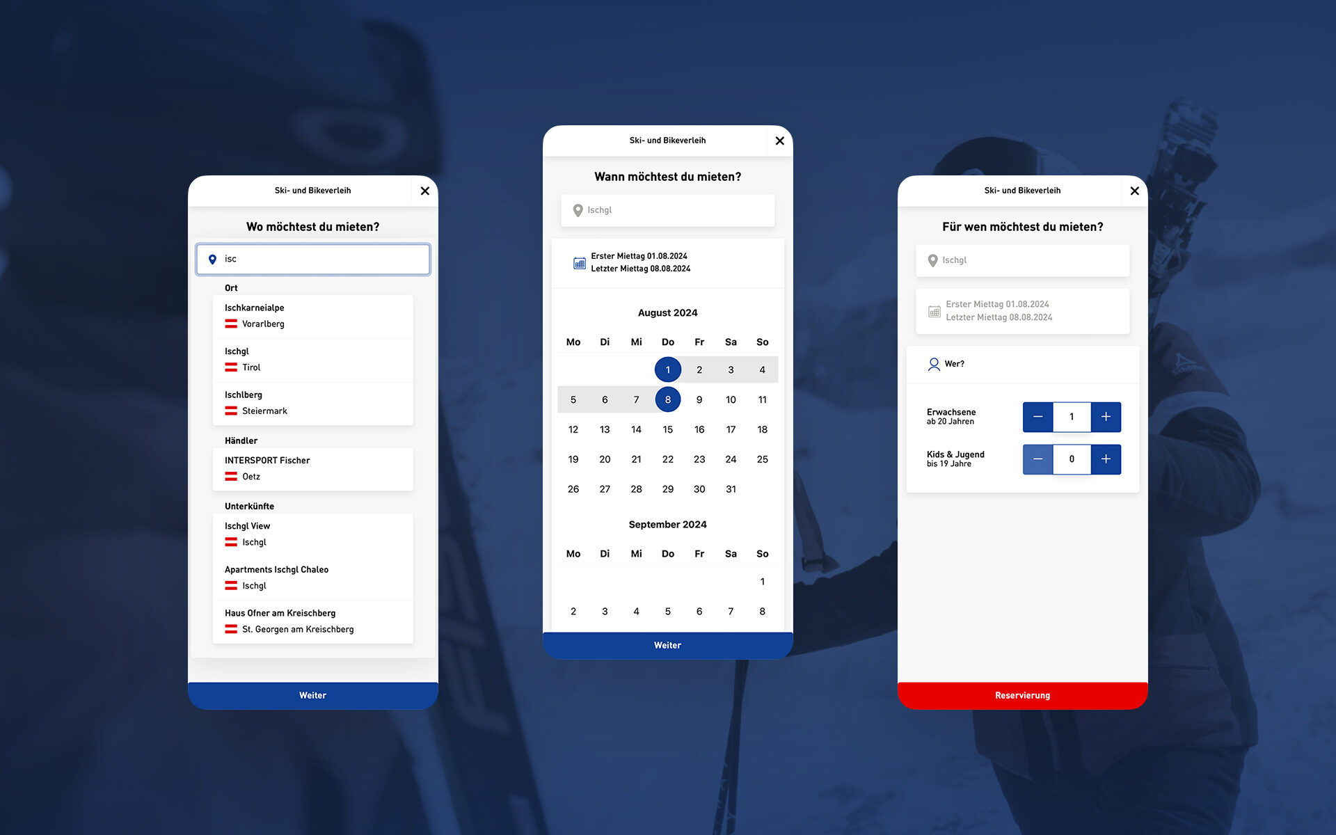 Die Suche nach dem nächstliegenden Standort ist bei einem flächendeckenden Händler-Netzwerk oft nicht einfach. Nach der Sucheingabe (Ort, Hotel, Region, Skigebiet, …) wird eine Gehzeitberechnung angezeigt und automatisch der passende Shop vorgeschlagen. Danach folgt die Zeitauswahl und Personenanzahl und schon kann aus einer Vielzahl von Produkten ausgewählt und die Reservierung online abgeschlossen werden.