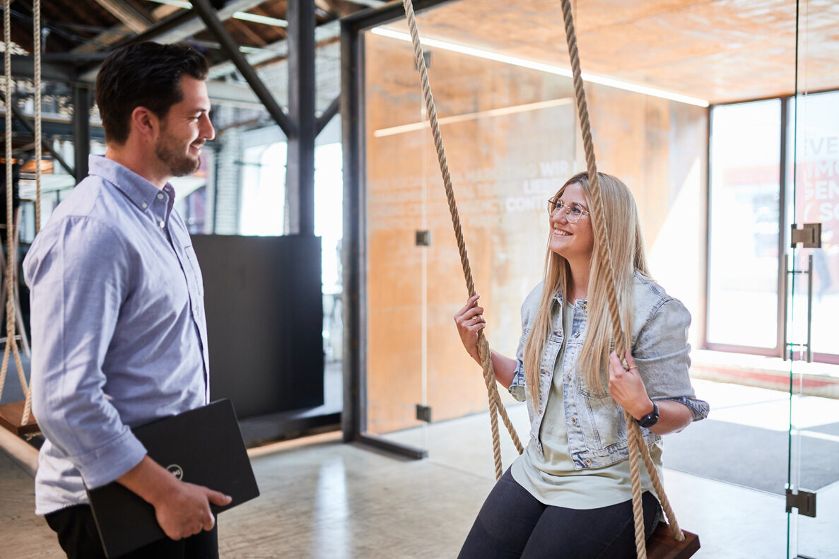 Eine junge Frau sitzt auf einer Schaukel in einem Industrial Style Office und lächelt ihrem valantic-Kollegen zu, der einen Laptop unter seinem Arm trägt.