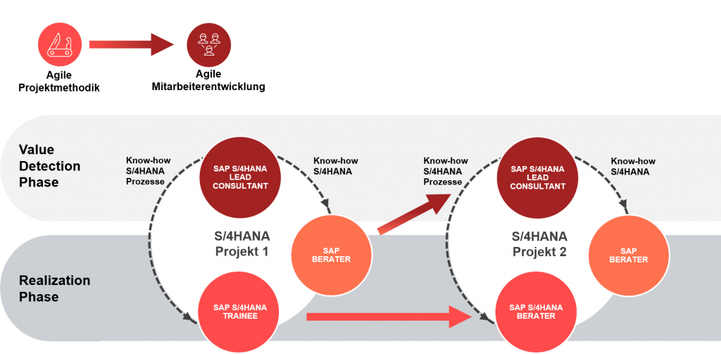 Nach dem selben Prinzip: Auch hier gibt der Lead Consultant sein S/4HANA-Expertenwissen im Projekt an den SAP ERP-Berater weiter. Mit zunehmender Erfahrung werden so aus SAP ERP-Beratern, S/4HANA-Spezialisten, die sukzessive die Rolle des Lead Consultants S/4HANA im nächsten Projekt einnehmen können. In diesem Kreislauf bewegen sich Technologie- und Prozess-Berater in einem kontinuierlichen Austausch und stellen so den erfolgreichen Projektverlauf sicher.