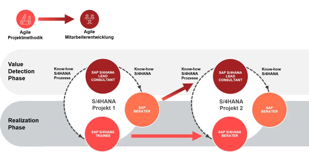 Wir definieren Rollen, keine Stellen, weil wir in unseren komplexen S/4HANA-Projekten selbstorganisierte, cross-funktionale, projektorientierte Teams brauchen, um erfolgreiche Lösungen für den Kunden zu konzipieren und umzusetzen. Der Unterschied zu früher ist, dass unsere Mitarbeiter nicht in einer Rolle bleiben, sondern in agilen Projekten durch systematischen „Wissenstransfer“ unterschiedliche Rollen einnehmen können.