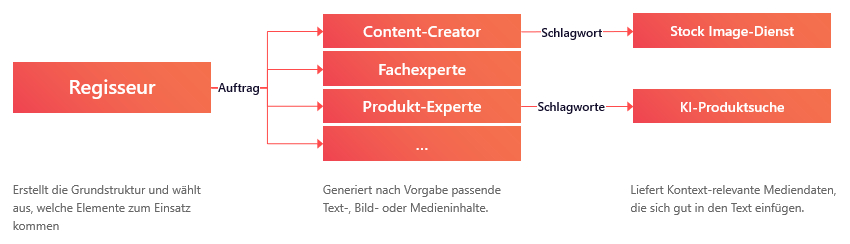 Das valantic Team ermöglicht durch den Einsatz eines mehrstufigen Multi-Agenten-Systems die automatisierte Erstellung von Marketingtexten, Produktbeschreibungen und multimedialen Inhalten. Das System arbeitet mit verschiedenen Rollen – „Agenten“ genannt. Dies umfasst z.B. einen „Regisseur“, einen „Content Creator“ und einen „Fachexperten“. Diese Agenten generieren individuelle Medieninhalte, die passgenau auf das jeweilige Produkt abgestimmt sind. Der Zeitaufwand für manuelle Arbeit wird durch den KI-basierten Content erheblich reduziert und ermöglicht Unternehmen eine deutliche Skalierung ihrer Content-Strategie. Gleichzeitig bleibt die nötige Qualität erhalten, mit der bei Suchmaschinen ein hohes Ranking erreicht wird.