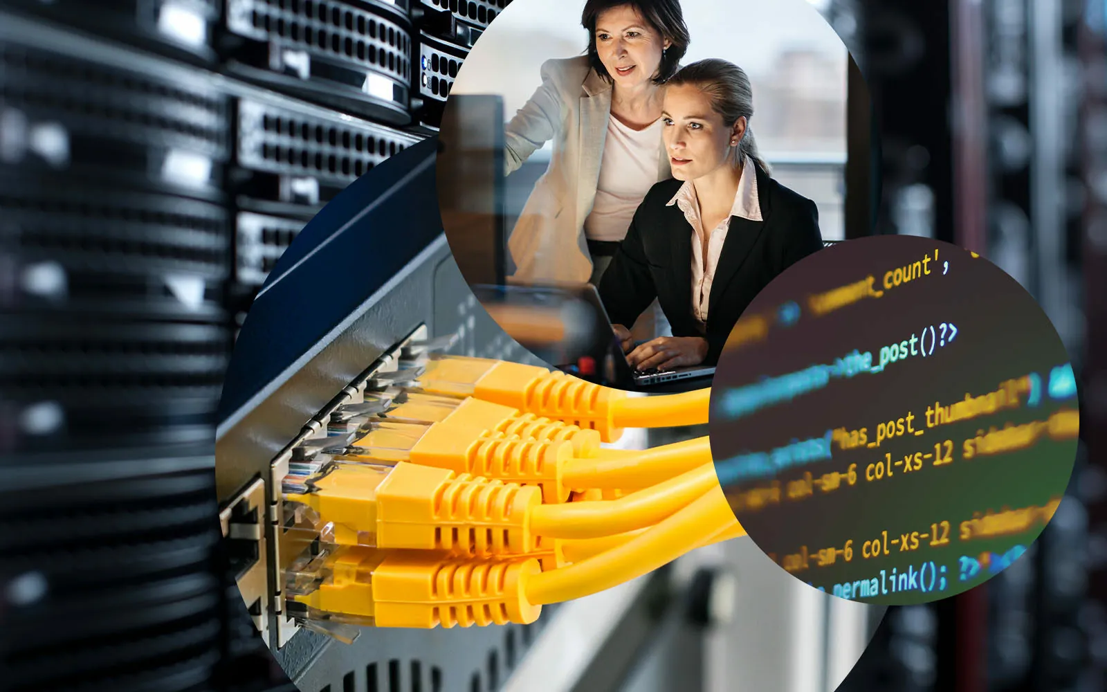 Bild von Kabeln und Codes auf einem Bildschirm, daneben zwei Frauen vor einem Computer; Darknet-Monitoring