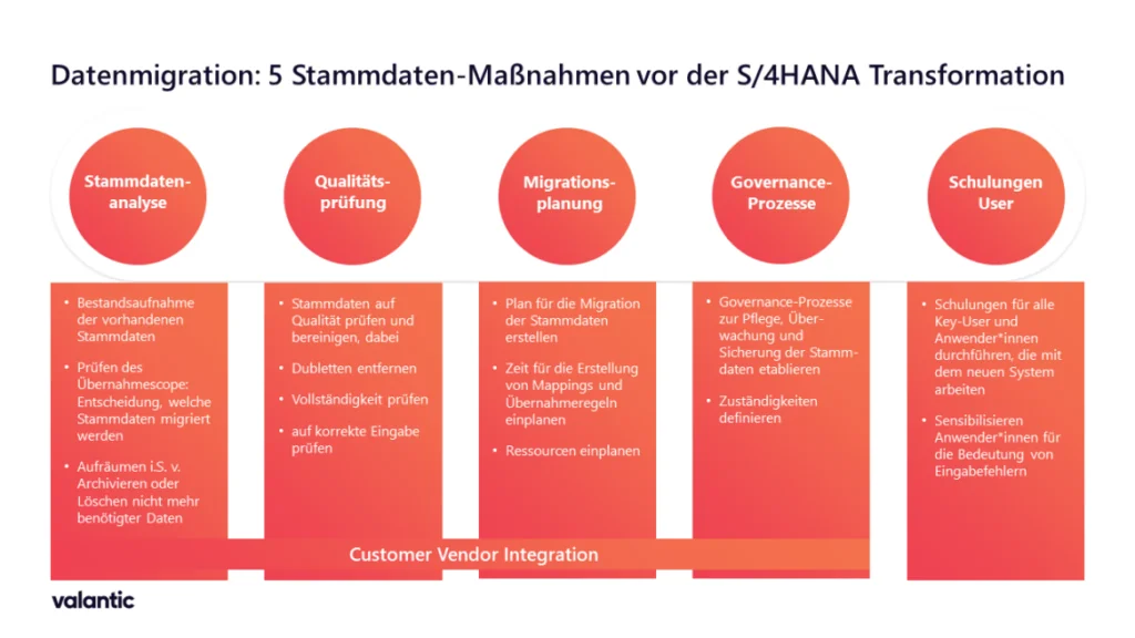 Unternehmen sollten Governance-Prozesse zur Pflege, Überwachung und Sicherung ihrer Stammdaten definieren. Hierzu gehören klare Zuständigkeiten und Verantwortlichkeiten für das Stammdatenmanagement und Transparenz über diese Prozesse für alle Mitarbeitenden. Durch unternehmensweit einheitliche Steuerungsprozesse bleibt die Datenqualität auch nach der Migration konstant hoch. Damit ist der Grundstein für eine kontinuierliche und effiziente Stammdatenverwaltung gelegt.