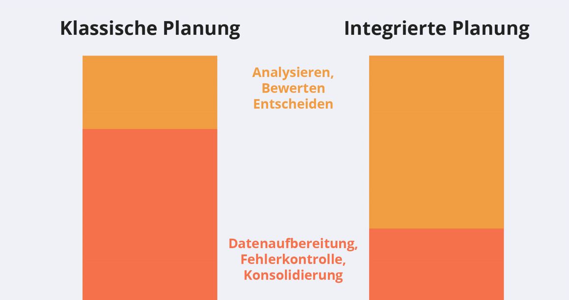 Im Ergebnis ist der Aufwand zur Datenaufbereitung, Fehlerkontrolle und Konsolidierung bei einer klassischen, nicht integrierten Planung zu hoch und geht auf Kosten gewinnbringender Analysen und Bewertungen. Integrierte Planung reduziert den Zeitaufwand dieser Datenverarbeitung deutlich. Somit können sich Unternehmen intensiver mit dem Analyse- und Entscheidungsprozess auseinandersetzen.