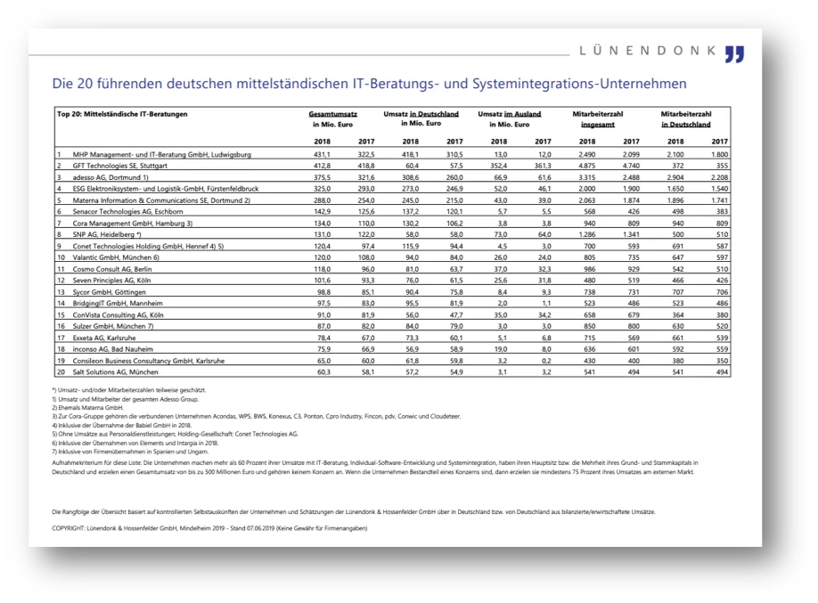 Die Lünendonk-Liste der 20 führenden deutschen mittelständischen IT-Beratungs- und Systemintegrationsunternehmen ist erschienen. Gerankt werden die größten Anbieter von IT-Beratungsleistungen mit einem Gesamtumsatz bis zu 500 Mio. Euro. Eine Top-Platzierung ist dabei auch für valantic sicher.