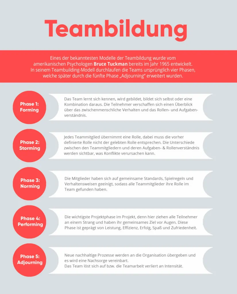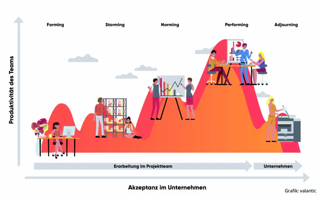 Ja, sehr gern. Dazu würde ich kurz auf die generellen Phasen von Teams eingehen, weil meine Erfahrung zeigt, dass jedes Thema von den Menschen im Unternehmen selbst getragen und getrieben wird. Auch wenn es offensichtlich ist, muss immer wieder daran erinnert werden, dass in Unternehmen Menschen arbeiten, die unterschiedliche Fähigkeiten, Vorlieben und Werte verfolgen. Dazu muss verstanden werden, dass viele Projektverzögerungen oder Eskalationen auf der Zusammenarbeit von genau diesen Menschen basieren. Daher ist es wichtig, auf die klassischen Team-Phasen einzugehen. Dazu gibt es zahlreiche Modelle, die im Kern immer ähnliche Punkte adressieren. Jedes Team durchlebt unterschiedliche Phasen der Zusammenarbeit, wobei gerade diese Phasen mithilfe von externer Unterstützung gezielt be- oder entschleunigt werden können. Folgende Abbildung (Modell nach Tuckman) zeigt beispielhaft eine Übersicht über fünf aufeinander folgende Teamphasen.