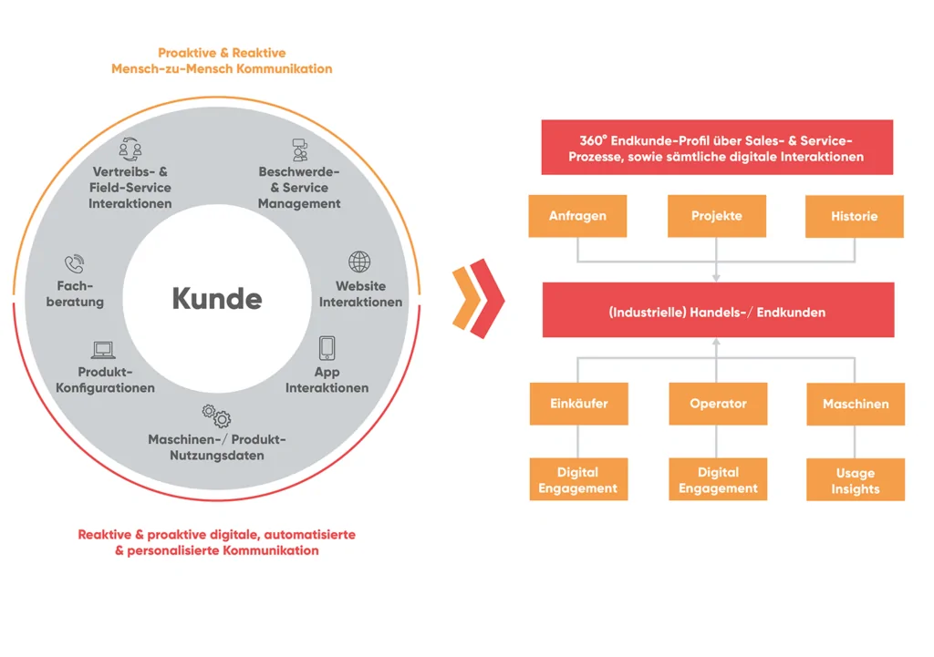 Die Customer Journey ist in der analogen Betrachtung zum Produktlebenszyklus das tragende Konzept. Eine konsistent gepflegte Wissensdatenbank im CRM erkennt Dynamiken frühzeitig. Das kann die dynamische Gestaltung von Touchpoints, wie etwa der Website mit Verweis auf ein digitales Anfrageportal mit Lead-Gen-Funktionen oder auch die kontinuierliche Weiterbildung der Vertriebsorganisation auf spezifische Trends und Entwicklungen beinhalten. Das oberste Gebot: Ab dem ersten Moment der Kundenbeziehung ein ganzheitliches Kundenbild entwickeln, das die Marketing-Aktivierung und den initialen Vertriebskontakt ebenso berücksichtigt wie die Fachberatung, das Service Management oder die Unternehmenskommunikation. Die Transparenz über die Kundenbeziehung hinweg sichert im Zusammenspiel mit Produktnutzungsdaten die Grundlage für datengetriebene Geschäftsmodelle.