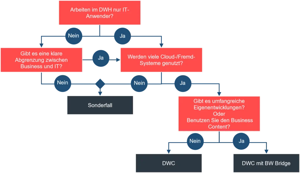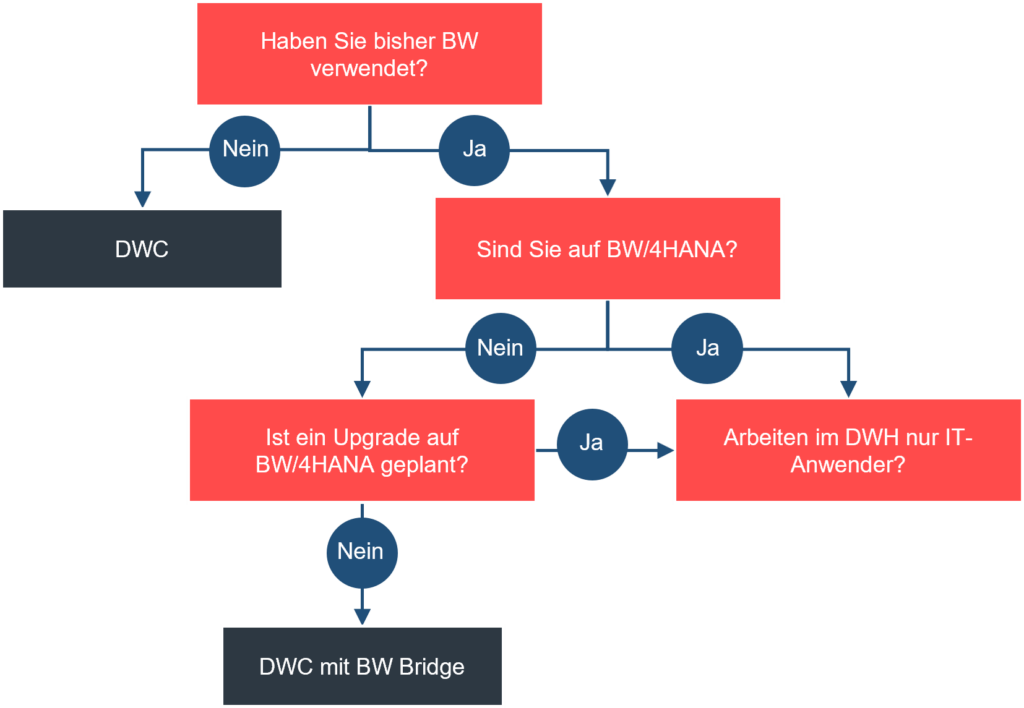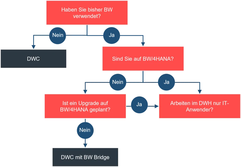 Ist bisher kein Data Warehouse im Einsatz, ist ein direkter Einstieg mit der SAP DWC zu empfehlen. Mit der SAP DWC wird die Cloud-Strategie der SAP verfolgt. Die SAP DWC kann als mögliche Alternative zu einem SAP BW gesehen werden und ist damit ein fortschrittliches Data Warehouse.
