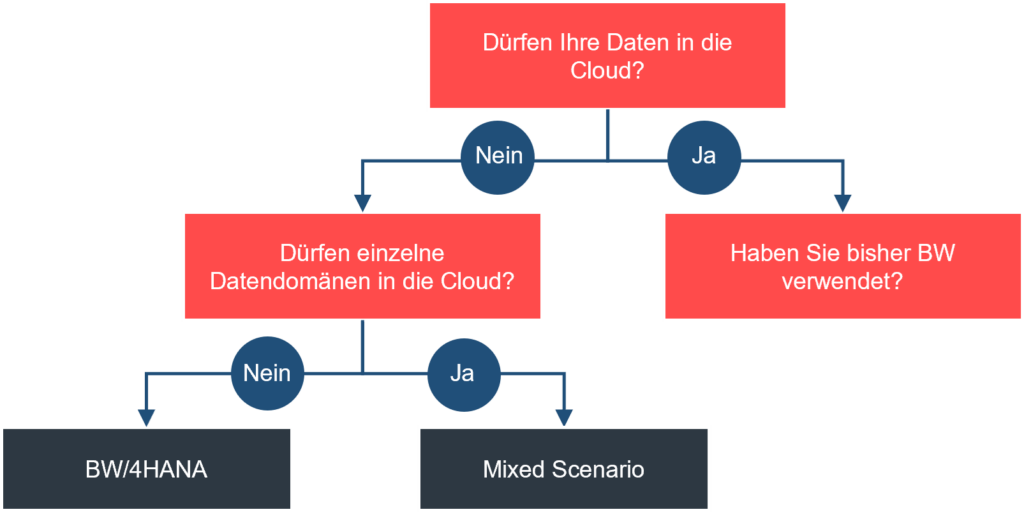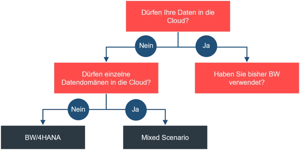 Ein erster Indikator, welcher Aufschluss über die Einsatzmöglichkeiten einer Data Warehouse Lösung in einem Unternehmen gibt, ist die datenschutzkonforme Speicherung der Daten. Unternehmen, die mit besonders sensiblen Daten arbeiten oder die strenge Richtlinien der Datenspeicherung verfolgen, könnten Probleme in der Cloud haben. Da die SAP DWC die Daten in einer Public Cloud verarbeitet, kann dies ein Ausschlusskriterium für die SAP DWC sein. Falls auch einzelne Datendomänen nicht in die Cloud dürfen, ist es sinnvoll das SAP BW/4HANA als alleinstehende Data Warehouse Lösung zu verwenden. Falls das SAP BW auf einem älteren Release ist, ist ein Upgrade nicht notwendig, aber in vielen Punkten empfehlenswert.