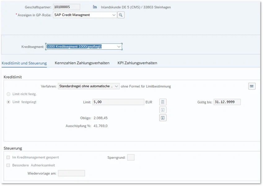 Über einen Absprung im Kopfbereich lassen sich die Kreditsegmentdaten wie das Kreditlimit pflegen, das auf Basis der Bonitätsprüfung und Risikoermittlung gewährt werden soll. Im selben Bereich kann eine Kreditlimit-Prüfung simuliert und der Kunde im Kreditmanagement gesperrt werden.