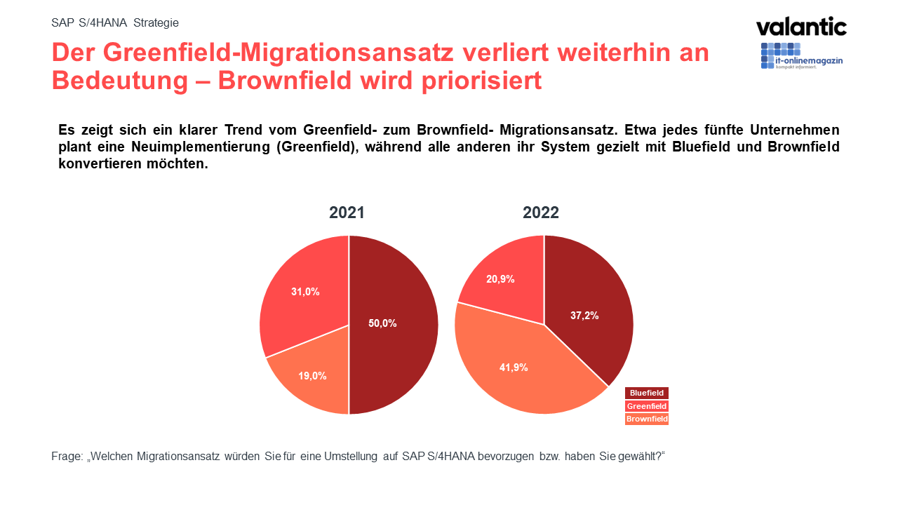 Einen weiteren interessanten Trend zeigt unsere diesjährige Studie bei der Frage nach dem bevorzugten Migrationsansatz. Fast 42% der teilnehmenden Unternehmen sprachen sich hier für die Brownfield-Methode aus – mehr als doppelt so viele wie 2021 (19%). Nur noch knapp 21% favorisieren eine Neuimplementierung nach dem Greenfield-Ansatz (2021: 31%). Den Bluefield-Ansatz, der Elemente von Greenfield und Brownfield kombiniert, wird in der diesjährigen Befragung von rund 37% der Teilnehmenden bevorzugt. 2021 war er mit 50% noch klarer Favorit.