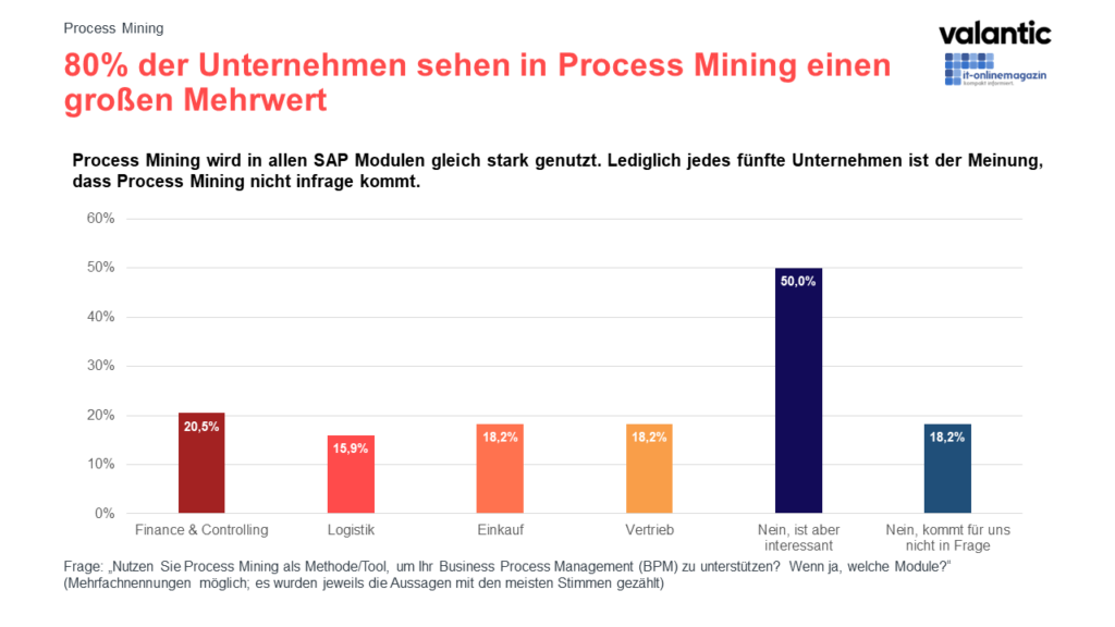 Business Process Intelligence spielt im Zuge der digitalen Transformation eine wichtige Rolle. Daher widmete sich die SAP S/4HANA Studie in diesem Jahr detaillierter dem Process Mining, der toolunterstützten Analyse von Geschäftsprozessen in Systemumgebungen. Mehr als 80% der Befragten sehen darin einen klaren Mehrwert – selbst wenn 50% es aktuell noch nicht nutzen, so halten sie es doch für interessant. Nur für rund 18% kommt Process Mining nicht infrage.
