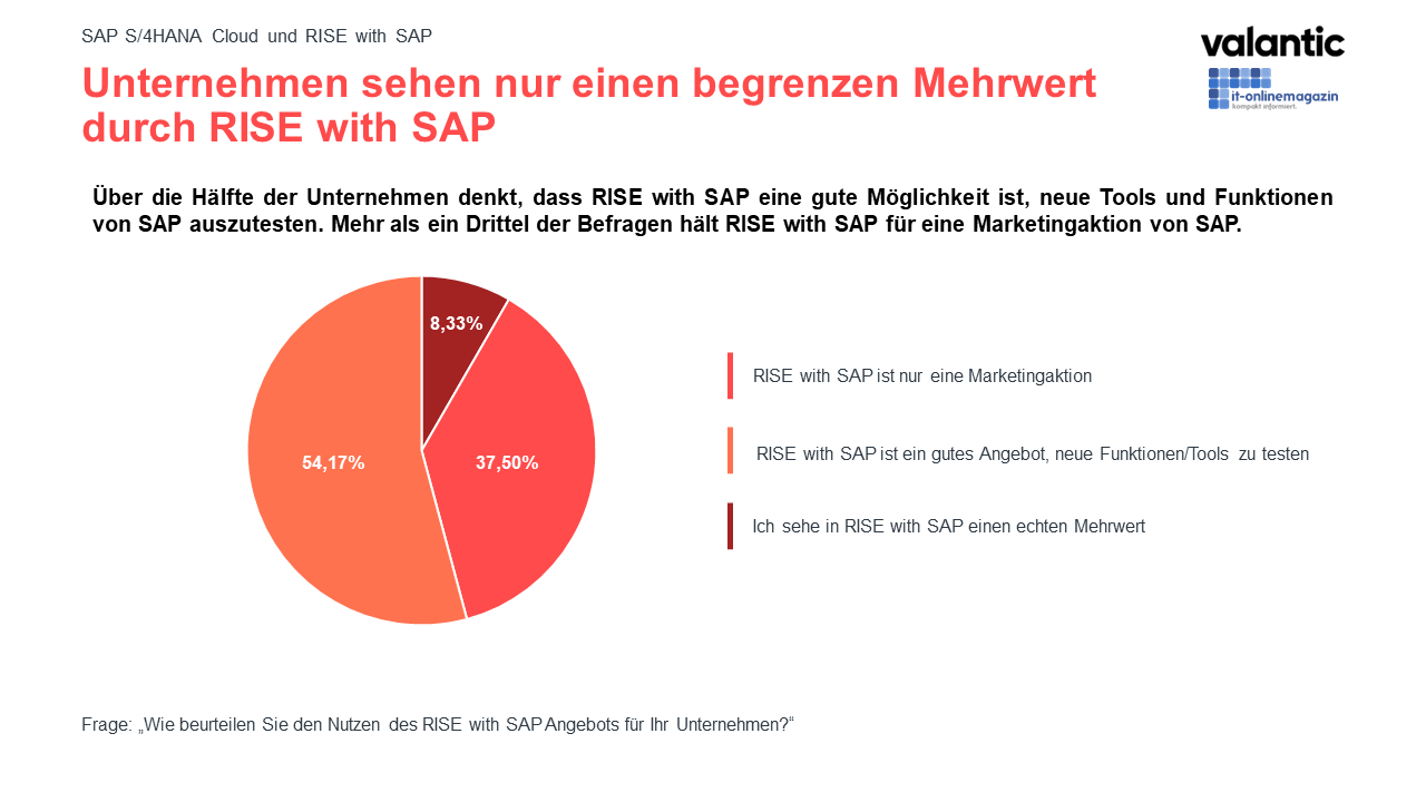 Seit Anfang vergangenen Jahres bietet SAP den Kunden mit RISE with SAP die Migration zu SAP S/4HANA als Transformation-as-a-Service (TaaS). In unserer Studie zeigte sich allerdings, dass das Angebot für die SAP Community nicht klar verständlich ist. Einen echten Mehrwert kann darin nur eine Minderheit von rund 8% erkennen. Rund 54% der Befragten halten RISE with SAP dennoch für ein gutes Angebot, um neue Funktionen und Tools kennenzulernen. 37,5% sehen darin wiederum lediglich eine Marketingaktion von SAP. Dabei ist RISE with SAP wesentlich für den Umstieg in die Cloud und bietet hierfür interessante Optionen. Angesichts der Komplexität des Angebots gibt es dazu offenkundig aber noch einigen Informationsbedarf.