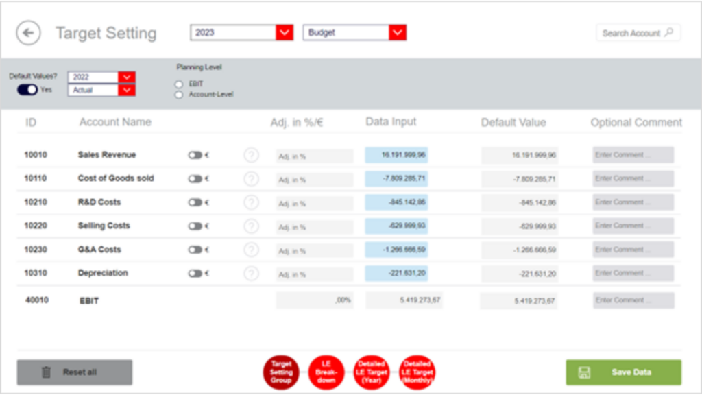 Die Basis bilden vorhandene Vergangenheitswerte, auf denen individuelle Ziele aufgesetzt werden können. In einem ersten Schritt erfolgt die Planung der gewünschten Targets auf Jahresebene für die gesamte Gruppe. Die Zielwerte können sowohl auf Account- als auch auf KPI-Ebene, beispielweise für EBIT, erfasst werden.
