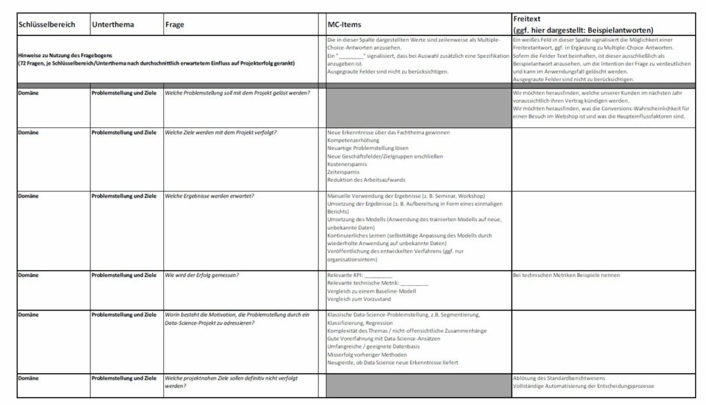 Hierzu wurden neben der Überarbeitung des bestehenden Data-Science-Vorgehensmodells auch neue Elemente hinzugefügt, die als praktische Arbeitsmaterialien und Orientierungshilfen genutzt werden können. Es wurde ein Fragebogen erstellt, der dazu dient, die Eckpunkte des Projektes sowie Ziele und Fallstricke für alle Stakeholder Schritt für Schritt transparent zu machen.