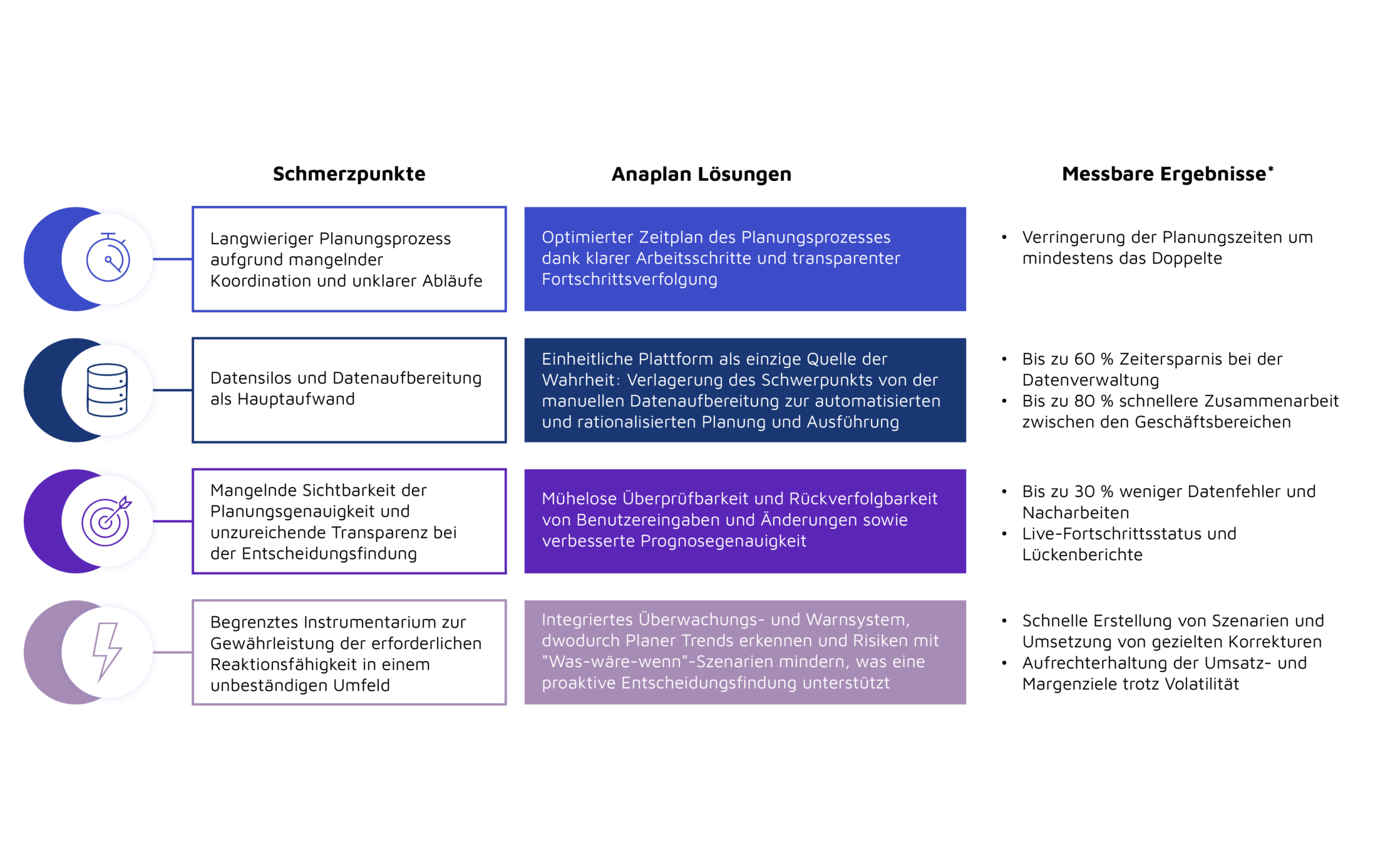 Anaplan löst vier zentrale Herausforderungen im MFP-Prozess, indem es Lösungen bietet, die die Planungsabläufe optimieren, Daten konsolidieren und Transparenz sowie Reaktionsfähigkeit steigern. Dadurch können Unternehmen schnellere Planungszyklen, ein effizienteres Datenmanagement und verbesserte Zusammenarbeit erreichen und ihre Verkaufs- und Margenziele auch in volatilen Märkten zuverlässig erfüllen.