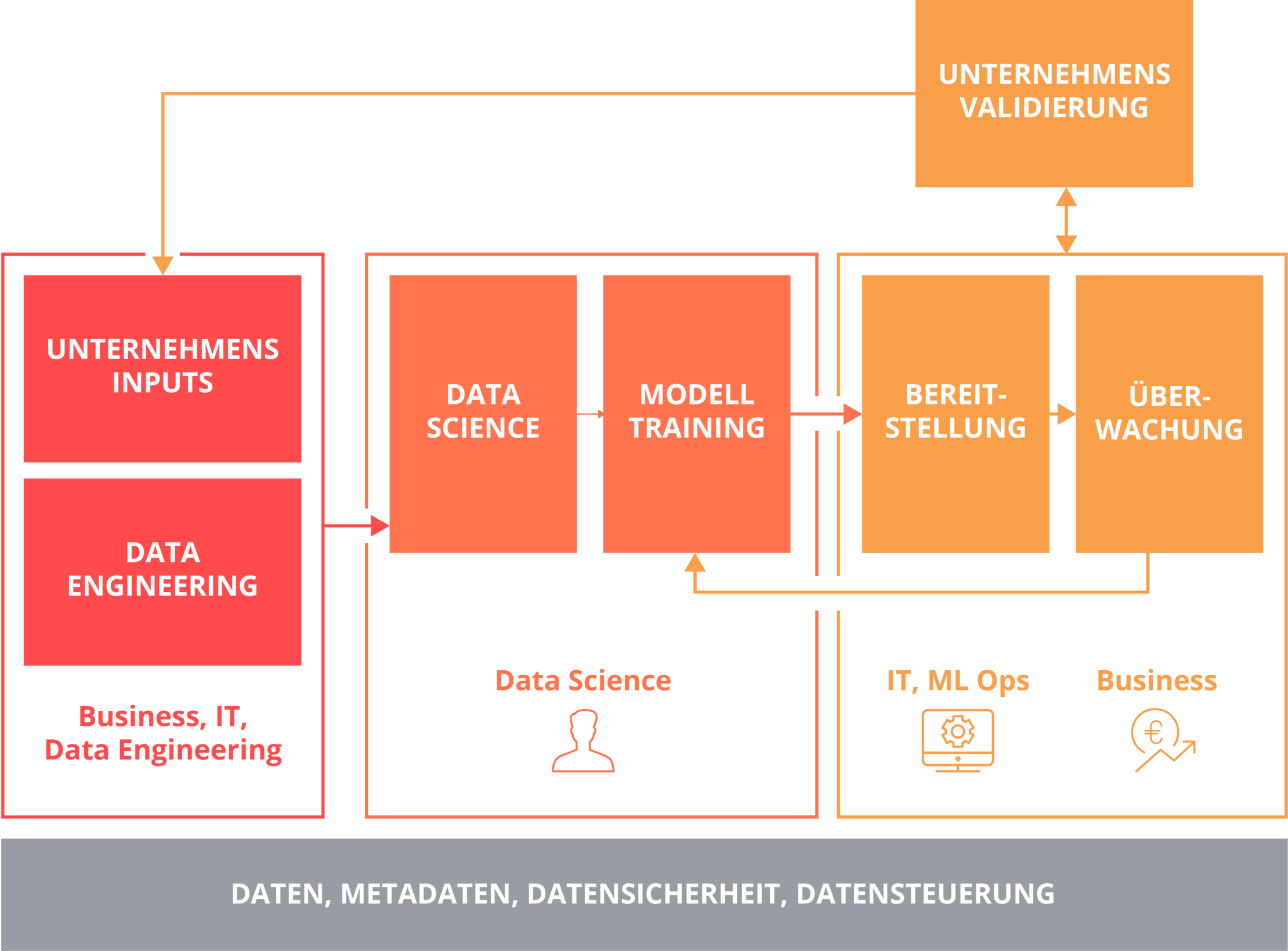 Bei der Einführung eines Data Science Anwendungsfalls in eine produktive Umgebung bestehen einige Herausforderungen. Die Implementation der Machine-Learning-Modelle (ML Code) stellt nur einen Bruchteil des Arbeitsaufwandes dar, den ein erfolgreiches Data Science Projekt ausmacht. Während Machine-Learning-Modelle oft auf Open-Source-Tools und -Werkzeugen basieren, arbeitet die klassische IT-Architektur häufig und aus gutem Grund mit proprietärer Software. Dieser Umstand macht eine enge Verzahnung von ML Code und IT Operations (MLOps) notwendig. Zu beachtende Faktoren sind dabei nicht nur die Bereitstellung der Machine-Learning-Modelle, sondern auch eine kontinuierliche Qualitätsprüfung. MLOps stellt eine effektive Nutzung der Analyseergebnisse sicher und sorgt so für eine gleichbleibende Qualität der Ergebnisse.