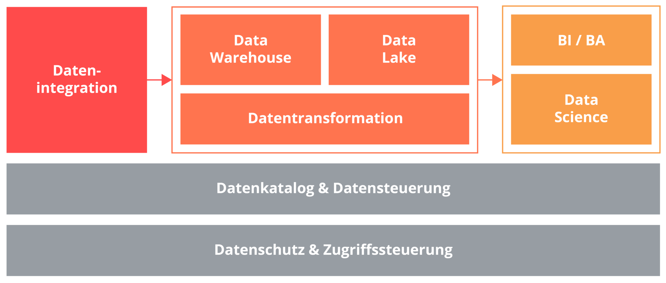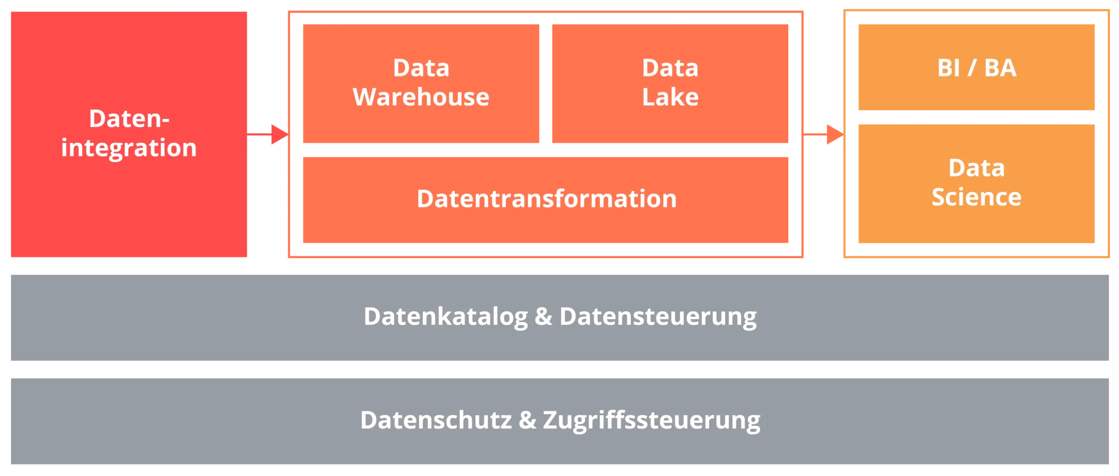 Die Eckpfeiler einer modernen Datenplattform sind das Data Warehouse und der Data Lake. Sie dienen als zentrale Bereitstellungsorte für strukturierte und unstrukturierte Daten (Big Data) und bereiten die Rohdaten mittels Datentransformation für Business Intelligence und Data Science Anwendungen auf. Die Datenintegration ist der Punkt, an dem der Aufbau einer Datenplattform beginnt. Hier werden Daten aus einer Vielzahl unterschiedlicher Datenquellen in das Data Warehouse oder den Data Lake geladen. Die Datentransformation ermöglicht die Bereinigung und Zusammenführung der Daten. Tools im Bereich Datenkatalog und Governance gestatten den Aufbau von Metadaten und Governance-Funktionen, um einen Katalog für Datenbestände zu erstellen, zu klassifizieren und zu verwalten.