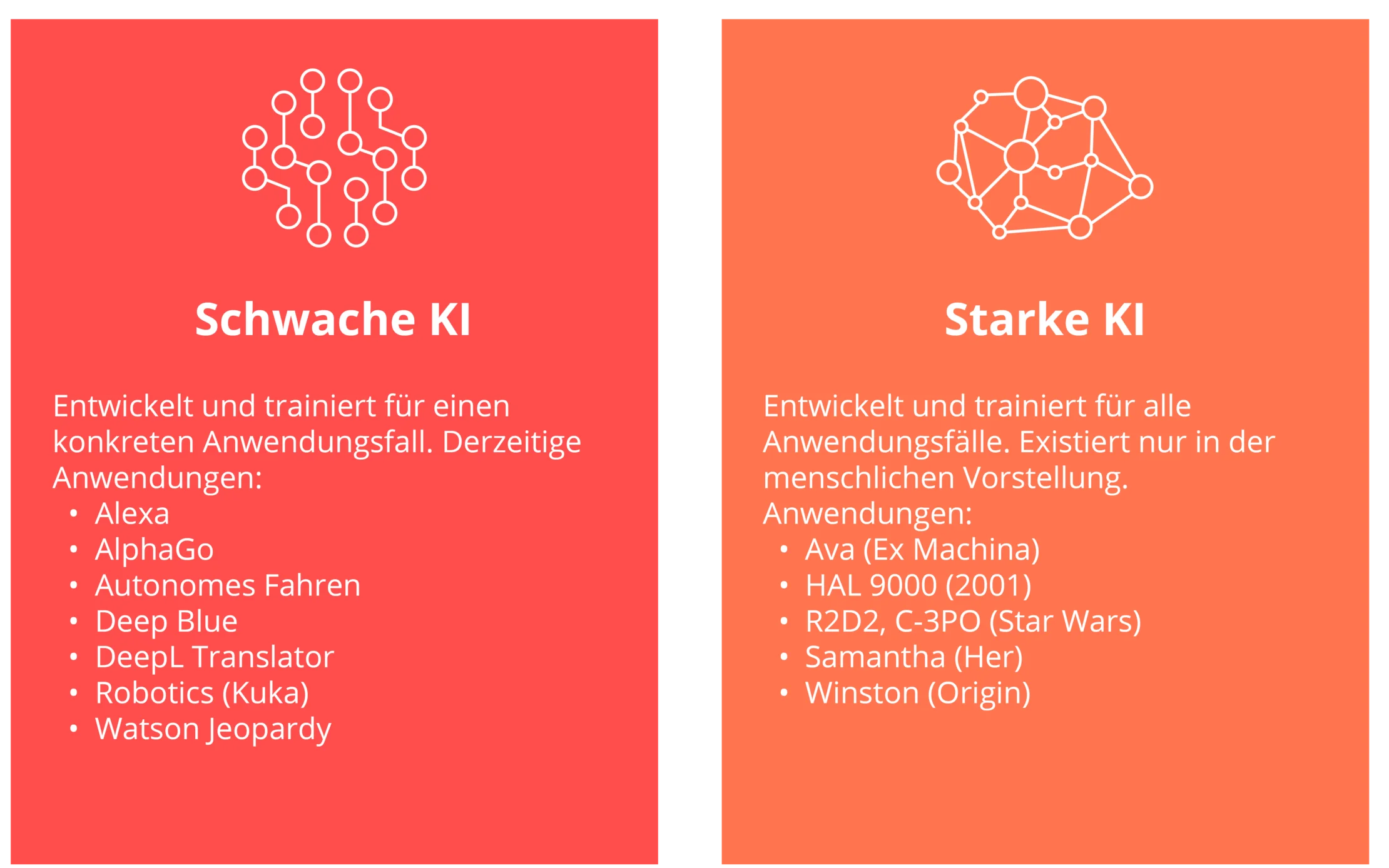Im Bereich der KI geht es um die Entwicklung von lernenden Algorithmen, die das menschliche Verhalten nachahmen. Dabei wird grundsätzlich zwischen starker KI (Strong AI / General AI) und schwacher KI (Weak AI / Narrow AI) unterschieden. Starke KI meint die Entwicklung eines Systems, welches die gleichen intellektuellen Fähigkeiten wie ein Mensch besitzt und damit in der Lage ist, jegliche Arten von allgemeinen Problemen zu lösen. Eine schwache KI beschreibt ein System, das mithilfe von Daten speziell für einen konkreten Anwendungsfall entwickelt und trainiert worden ist. Während die starke KI noch Zukunftsmusik bleibt, wird die schwache KI bereits heute in vielen Unternehmensbereichen angewendet. Zu den gängigsten Anwendungen zählen: