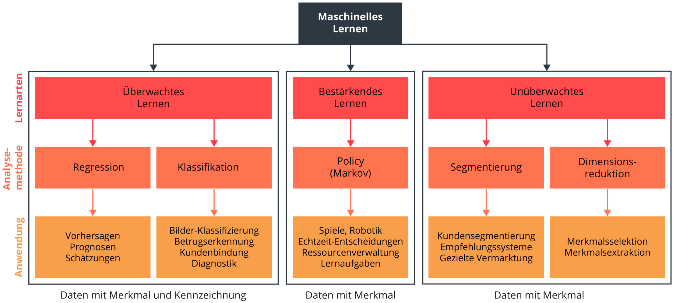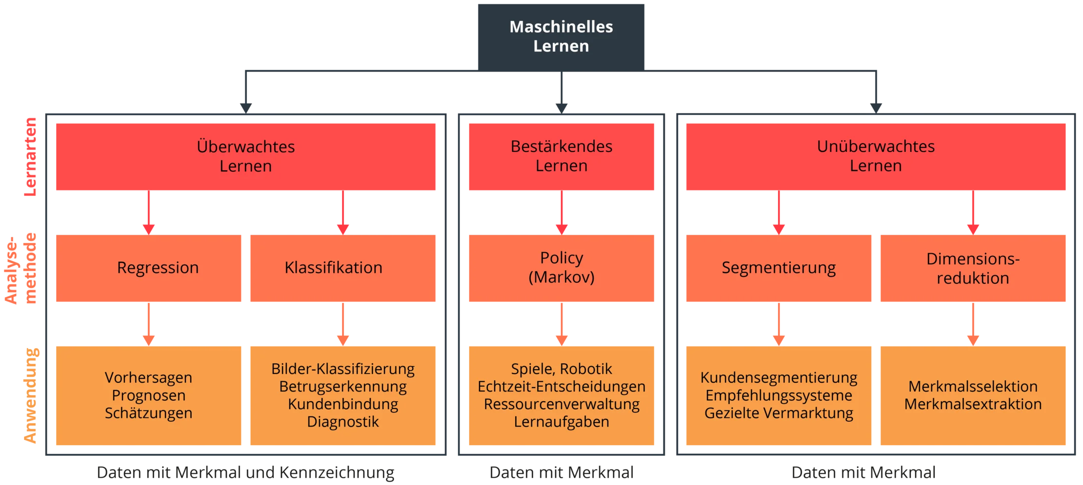 Maschinelles Lernen (Machine Learning) beschreibt die Anwendung von lernenden Algorithmen mit dem Ziel, Vorhersagen zu treffen oder unbekannte Muster und Gesetzmäßigkeiten in Daten zu entdecken. Diese lernenden Algorithmen werden anders als klassische Algorithmen nicht programmiert, sondern mittels Daten trainiert und stetig verbessert. Dadurch können Machine-Learning-Algorithmen flexibel in einer Vielzahl von Anwendungsgebieten eingesetzt werden. Je nach Use Case lassen sich unterschiedliche Machine-Learning-Modelle aufbauen und nutzen. Das maschinelle Lernen unterteilt sich in drei Arten: das überwachte Lernen (Supervised Learning), das unüberwachte Lernen (Unsupervised Learning) und das bestärkende Lernen (Reinforcement Learning).