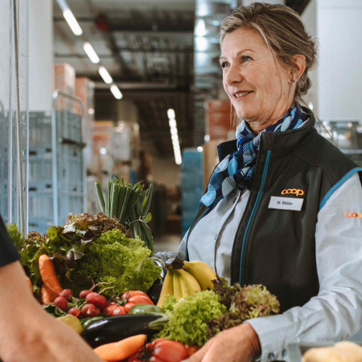 Bild von Coop Mitarbeitenden die eine Gemüsebox versorgen, Omnichannel Plattform