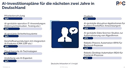 Deutschland gibt in Sachen Künstlicher Intelligenz (KI) und generativer KI wie ChatGPT endlich Gas; die Zeichen stehen auf Investitionen. Das Analystenhaus Pierre Audoin Consultants (PAC) hat 130 Entscheider in deutschen Unternehmen gefragt, in welche KI-Bereiche sie in den nächsten zwei Jahren vorrangig investieren wollen und wo sie sich den größten geschäftlichen Mehrwert erhoffen. Die Ergebnisse im Überblick: