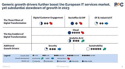 Es gehe 2023 weniger um Wachstum, sondern um Kostensenkungen und mehr Effizienz, unterstrich Christophe Chalons, Chefanalyst bei PAC, auf den PAC Horizons 2023. Diese beiden Trends seien in den letzten zwei Jahren überproportional gewachsen. Eine Rückkehr des Wachstums in Europa und in Deutschland stellt Chalons für etwa Ende 2024 in Aussicht.
