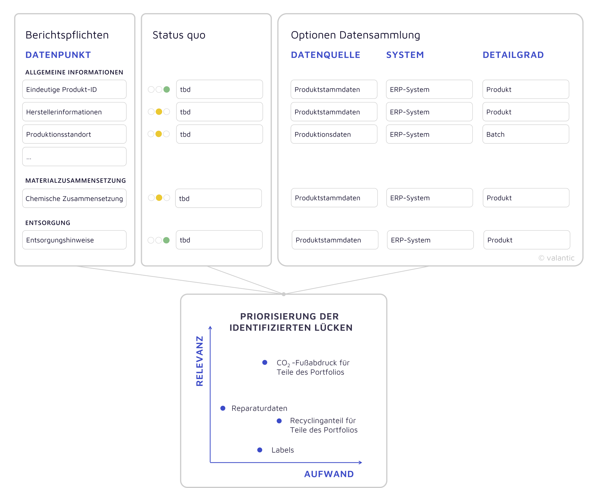 Auf Basis der regulatorischen Anforderungen prüfen wir, welche DPP-relevanten Daten in Ihrem Unternehmen bereits vorliegen und wo noch Lücken bestehen. Dies umfasst sowohl Produkt-, Prozess- als auch IT-bezogene Informationen.