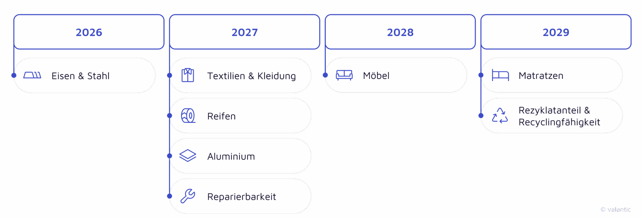Der DPP wird schrittweise in Form von delegierten Rechtsakten auf Ebene einzelner Produkte oder horizontal für ganze Gruppen vergleichbarer Produkte eingeführt. In einem ersten Arbeitsplan wurden sechs Produktgruppen und zwei horizontale Anforderungen definiert, die bis 2030 umgesetzt werden sollen.