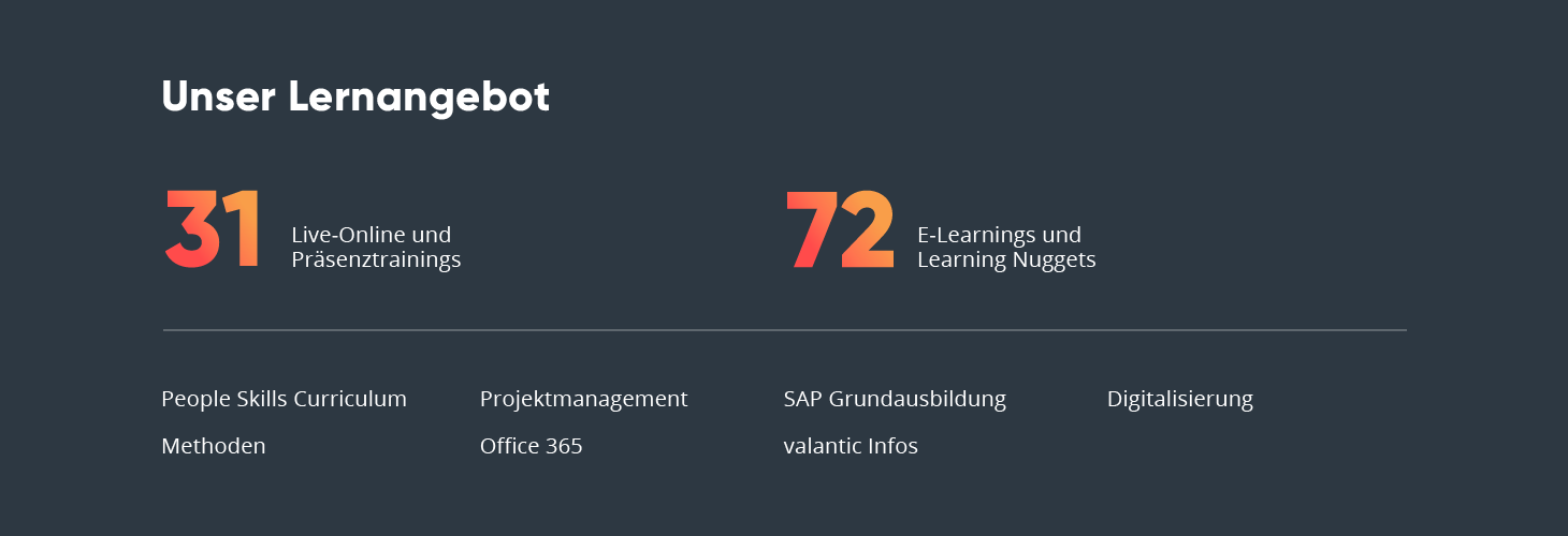 Unsere Lernangebote sind so agil wie die Organisation selbst: Einige Lernangebote haben einen festen Rahmen, da sie regelmäßig und wiederkehrend gebraucht werden, andere werden einmalig oder nur für einen kurzen Zeitraum angesetzt. Es ist Aufgabe der valantic Academy, Ausbildungsprogramme bedarfsorientiert anzubieten und jederzeit anzupassen, wenn nötig.