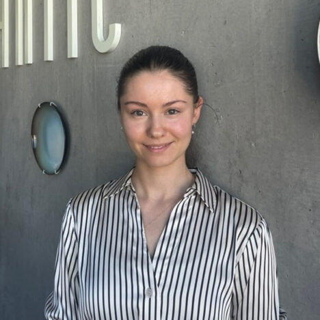 Eine Frau mit zurückgebundenen dunklen Haaren und einem schwarz-weiß gestreiften Hemd steht vor einer grauen Wand mit teilweise weißer Schrift und kreisförmigen Akzenten.