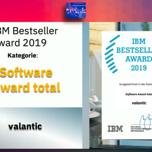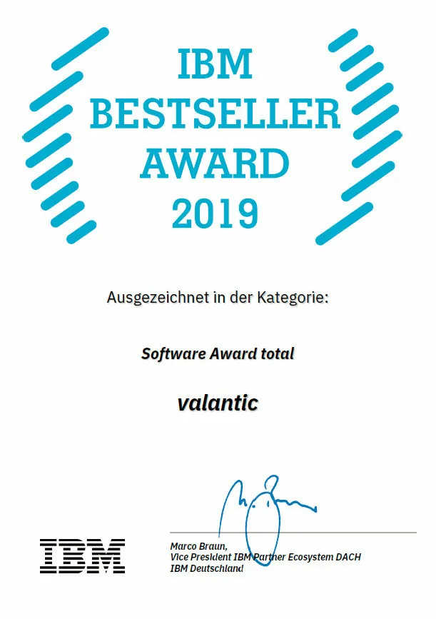 Mehr über uns erfahrenHamburg, 27. Mai 2020: Erfolg für valantic: IBM Deutschland hat valantic mit dem IBM Bestseller Award 2019 geehrt. Die Digital Solutions-, Consulting- und Software-Gesellschaft erhielt die begehrte Auszeichnung in der Kategorie „Software Award total“. Mit dem Preis prämiert IBM nicht nur das überdurchschnittliche Wachstum seines Partners valantic in drei Geschäftsfeldern, sondern auch die strategische Ausrichtung für eine Weiterentwicklung der erfolgreichen Zusammenarbeit.