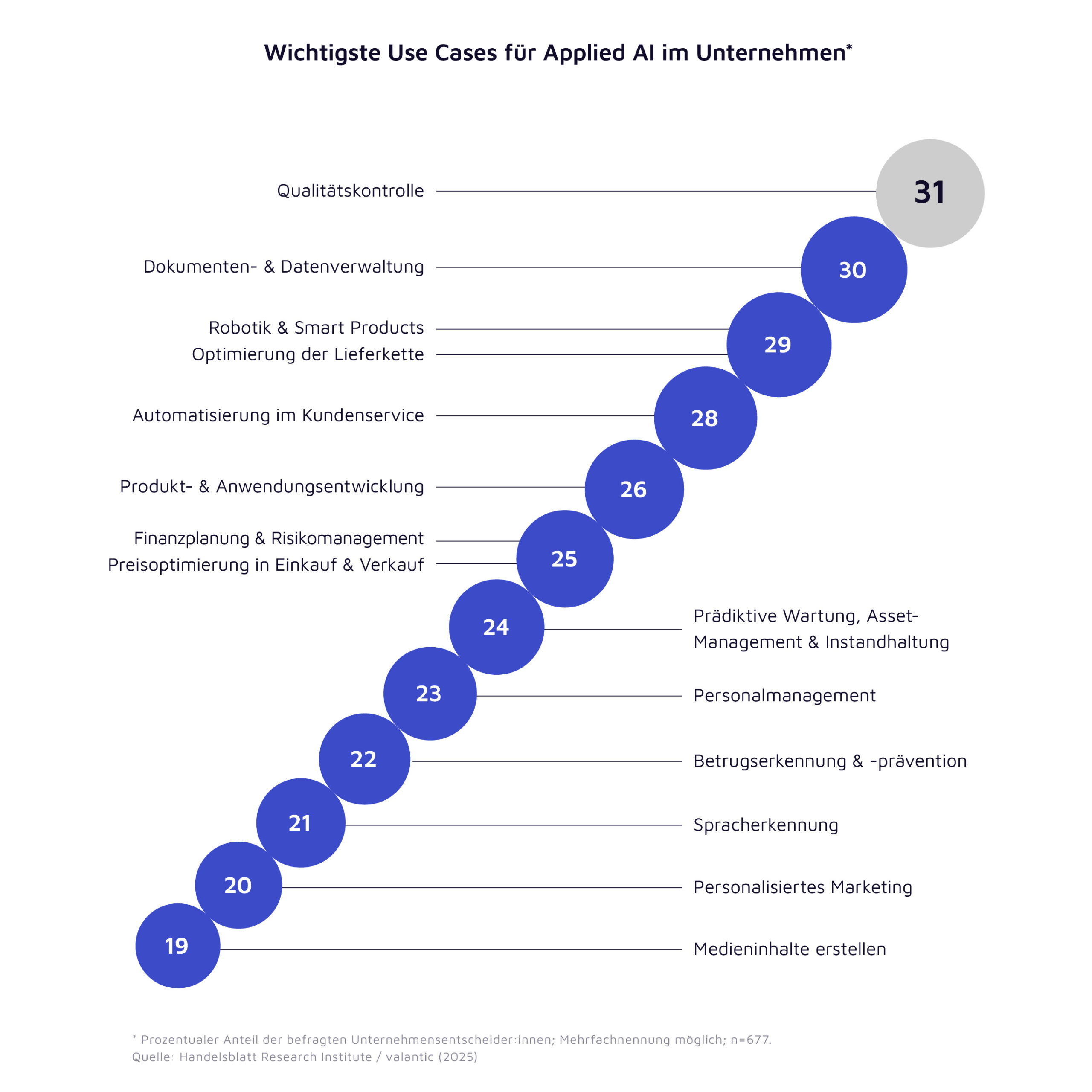 Mehr über uns erfahrenMünchen, 03. April 2025: Künstliche Intelligenz unterstützt die Prozesse von DACH-Unternehmen inzwischen auf vielfältige Weise. Welche Anwendungsfälle für die Unternehmen dabei besonders wichtig sind und welche Rolle hierbei die Branchenzugehörigkeit spielt, hat das Digital Consulting-, Solutions- und Software-Haus valantic in Zusammenarbeit mit dem Handelsblatt Research Institute (HRI) untersucht. Es zeigt sich: Vor allem bei der Qualitätskontrolle sowie der automatisierte Daten- und Dokumentenverwaltung stehen KI-Anwendungen bei den Unternehmen bereits hoch im Kurs. Auch die Lieferkettenoptimierung mit KI ist für viele ein wichtiges Einsatzfeld.