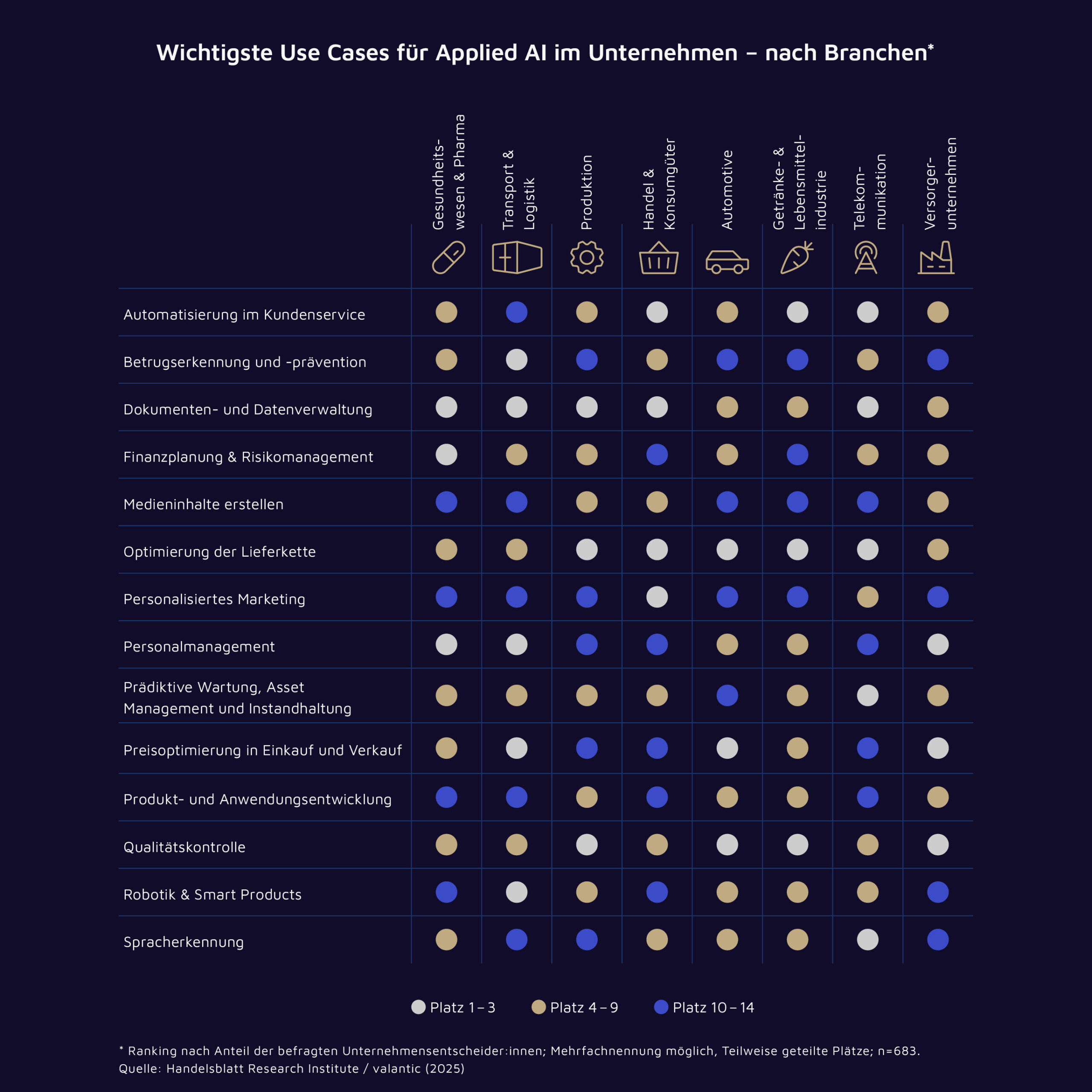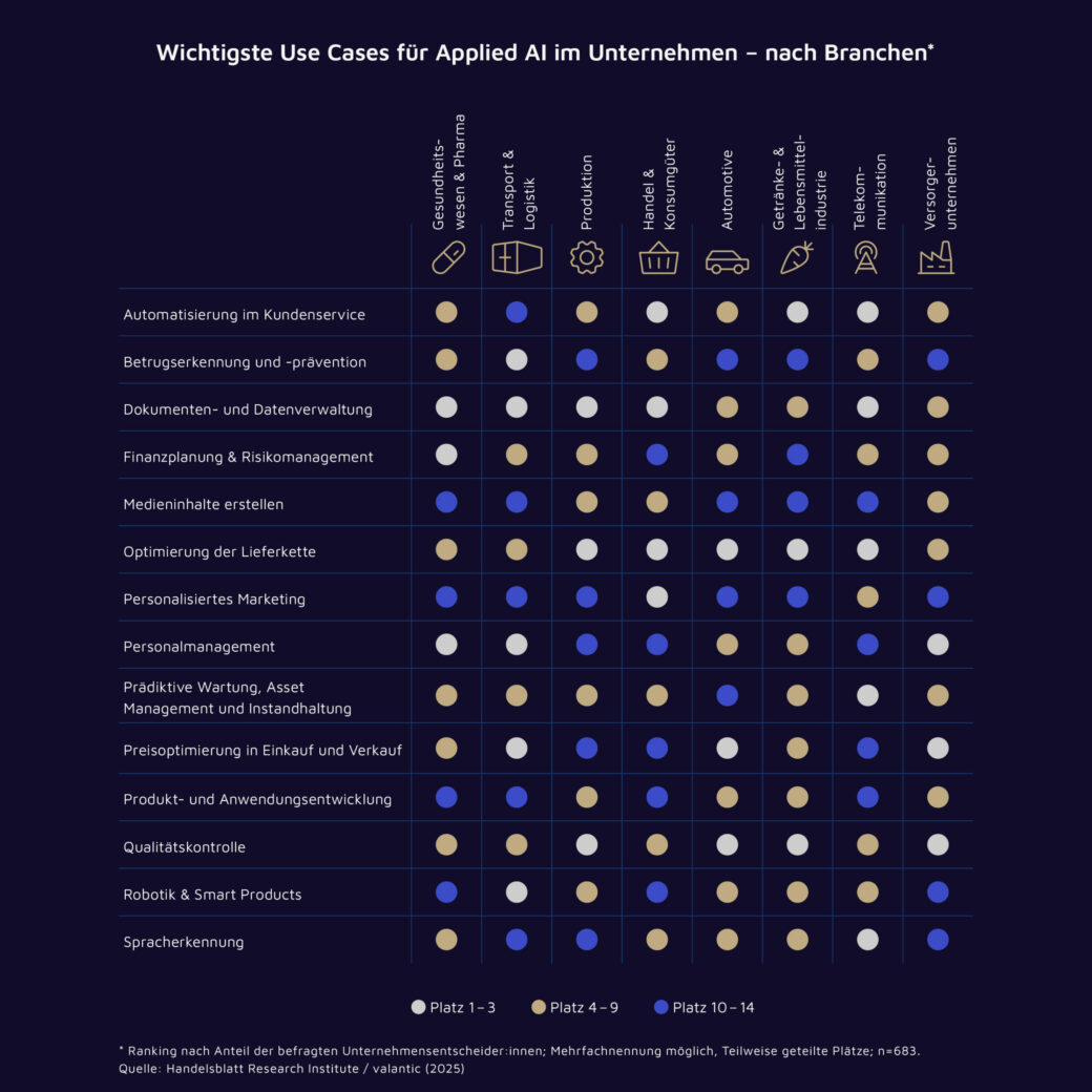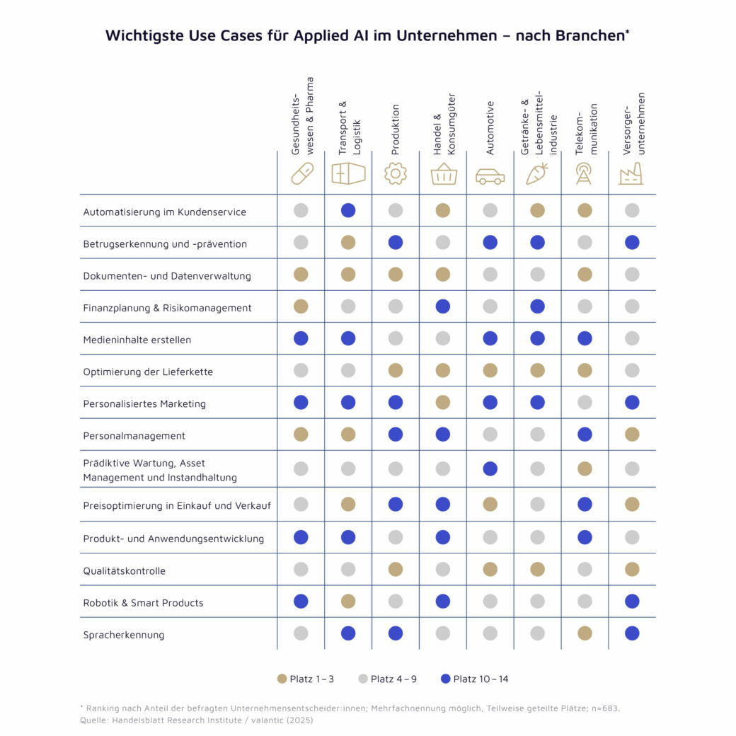 Anwendungsbereiche von KI: Relevanz unterscheidet sich nach Branchenzugehörigkeit.