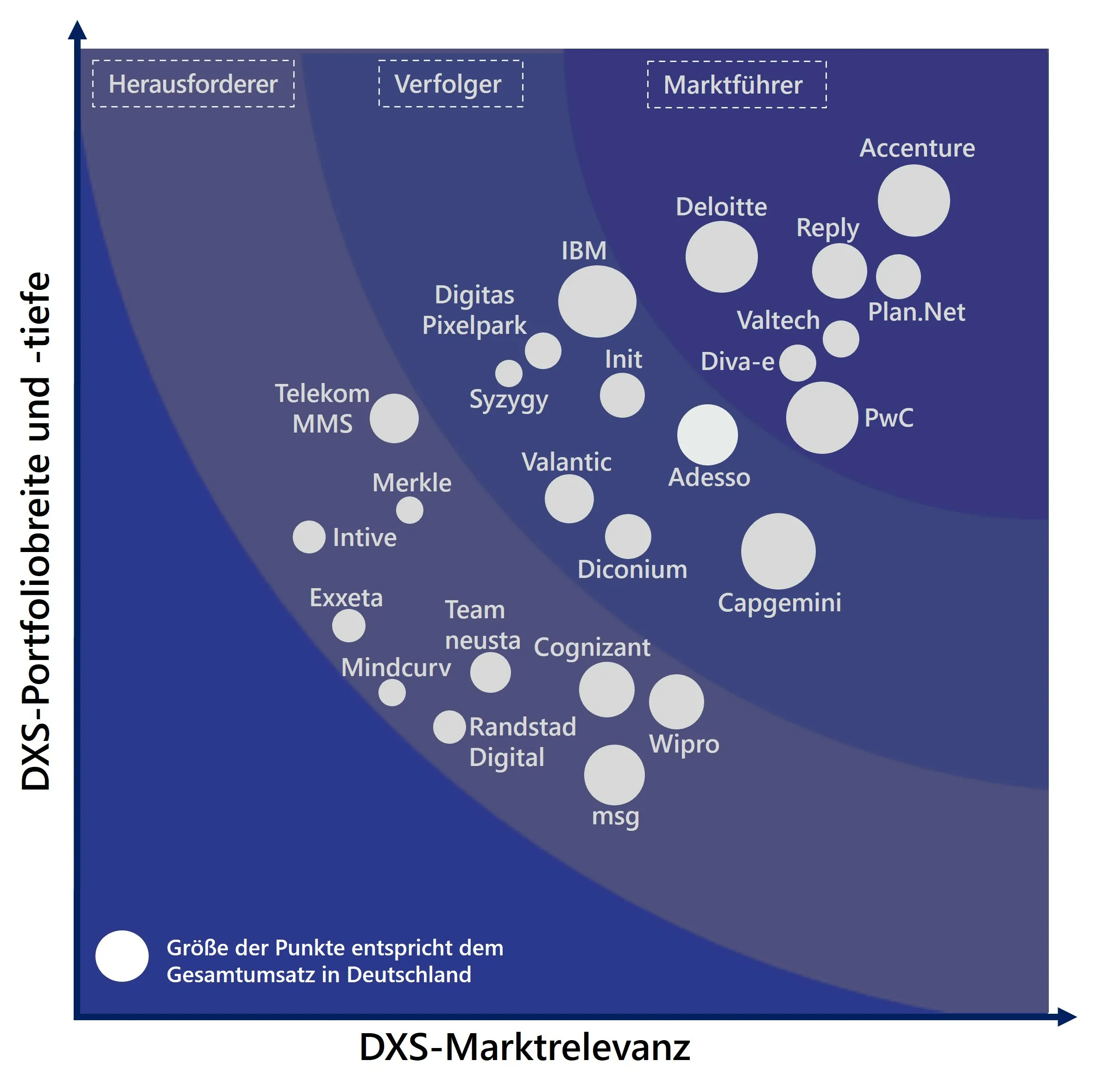 Um die DXS-Marktrelevanz einzelner Anbieter einzuordnen, setzt Lünendonk die Dienstleister neben ihrer Umsatzentwicklung auch mit Blick auf die jeweiligen Portfolioschwerpunkte, Marktanteile und ihrer Wahrnehmung am Markt ins Verhältnis. Das Ergebnis: valantic schließt im DXS-Markt als einziger Akteur unter den Teilnehmern von den Herausforderern zu den Verfolgern auf. Ein wesentlicher Grund für die positive Entwicklung von valantic im Bereich DXS sei laut Lünendonk der fokussierte Ausbau des Serviceportfolios – nicht zuletzt durch gezieltes Recruiting, sodass valantic seinen Kunden mittlerweile mit über 1.000 spezialisierten Beratern und Beraterinnen zur Seite stehe.