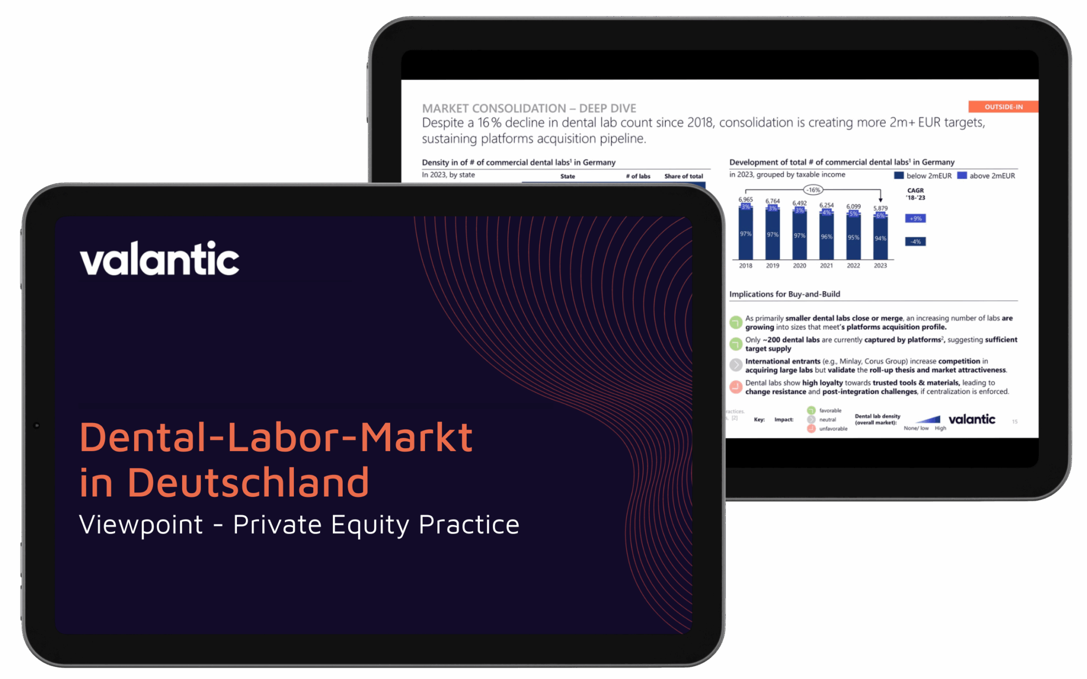 Erfolgreiche Plattformbetreiber konzentrieren sich auf hochwertige, „made-in-Germany“-Prothetik und Implantatrestaurationen, um Preise und Qualität zu sichern. Einige haben SaaS-artige Portale etabliert, die als unkomplizierte Ebene für Fallmanagement und Abrechnung dienen. Trotz eines Rückgangs der Anzahl von Laboren um 16 % seit 2018 auf etwa 5.879 im Jahr 2023 wuchs das Pool von mittelgroßen Übernahmekandidaten (>2 mEUR steuerpflichtiges Einkommen) um etwa 9 %, was den Akquisitionsprozess stützt. Zu den Hauptrisiken zählen Fachkräftemangel, Abhängigkeit von gesetzlichen Erstattungssystemen sowie technische Disruption durch 3D-Druck, der sich hauptsächlich auf einfache ästhetische Arbeiten auswirkt.