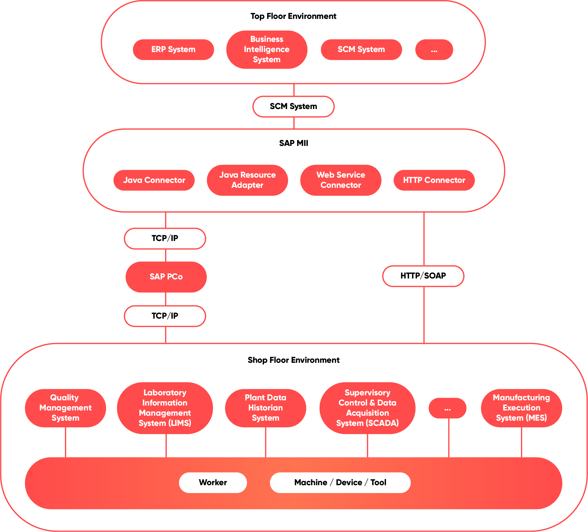 Als Teil der SAP Manufacturing Suite verbindet SAP Manufacturing Integration and Intelligence (SAP MII) als bidirektionales Informationsmanagementsystem die IT der Produktionsebene (Shop Floor) und MES-Systeme (SAP ME und Non-SAP MES-Systeme) mit dem SAP ERP (Top Floor) und bringt so Transparenz in Produktionsprozesse.
