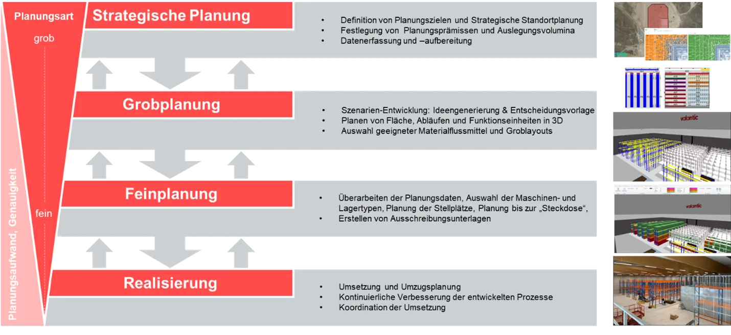 Von der Werkstrukturplanung über die Lagerplanung, das Materialflussdesign bis zum Prozessdesign