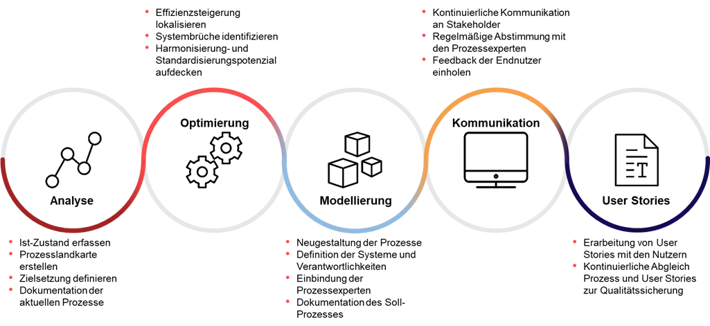Mit unserer standardisierten und konsequenten Prozessdesign-Methodik unterstützt valantic bei der Neugestaltung der Geschäftsprozesse. Wir analysieren gemeinsam mit den Prozessexperten vor Ort die aktuellen Prozesse, decken Potenziale auf, harmonisieren Prozesse und erarbeiten so eine neue Prozesslandschaft. Der Fokus liegt auf einer zielgerichteten und effizienten Prozessdokumentation, der Definition von eindeutigen Verantwortlichkeiten, um auch zukünftig die Prozesse kontinuierlich zu verbessern. Bei der Entwicklung des neuen Prozesses ist eine enge Zusammenarbeit und der Austausch mit den jeweiligen Experten notwendig, damit bereits zu Beginn eine hohe Akzeptanz im Unternehmen entsteht.