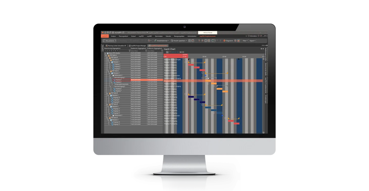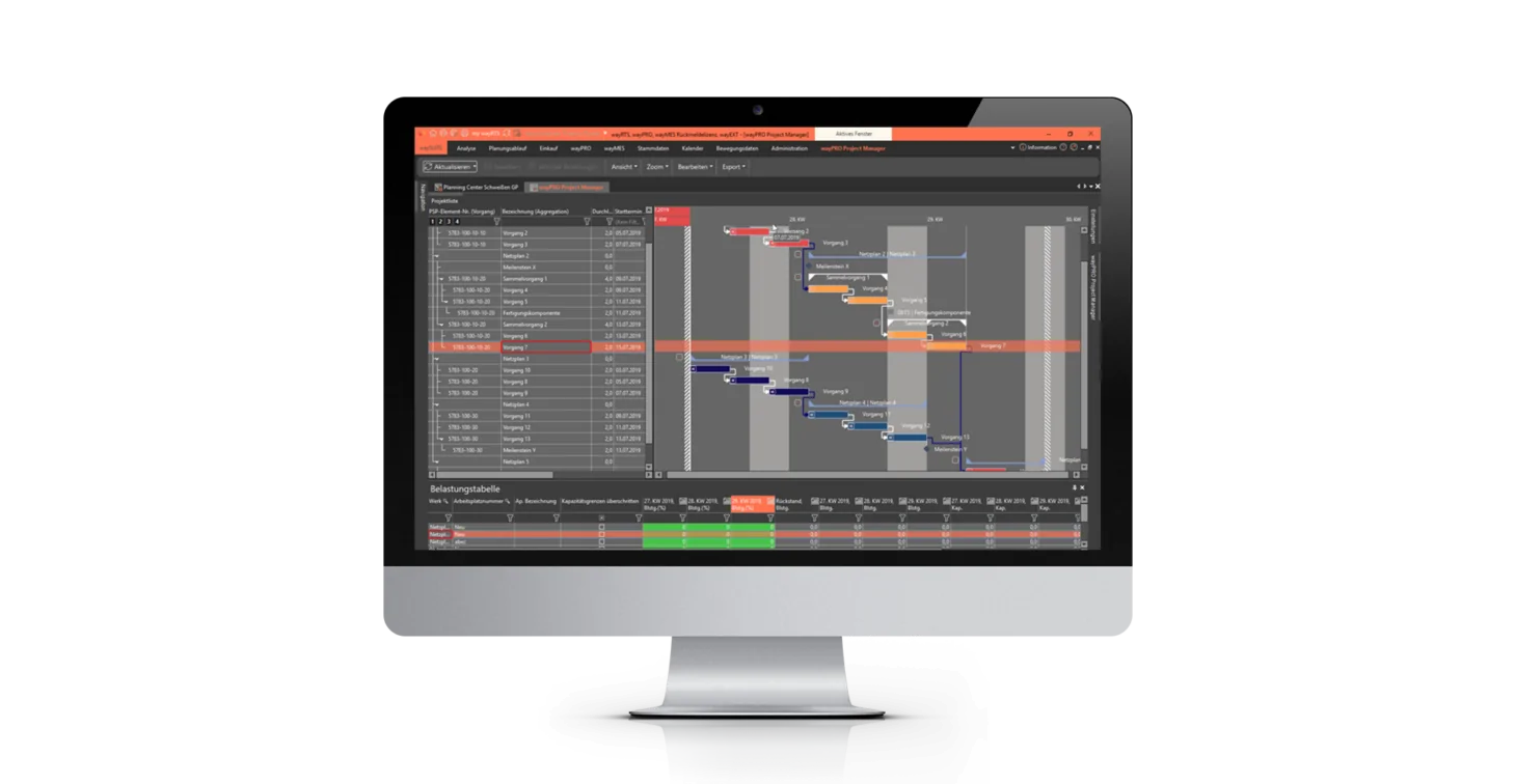 Der Projektmanager unterstützt Sie bei der interaktive Multiprojektplanung. Alle benötigten Informationen über Termine, Kapazitäten, Meilensteine und Materialversorgung stehen in einer Ansicht zur Verfügung.