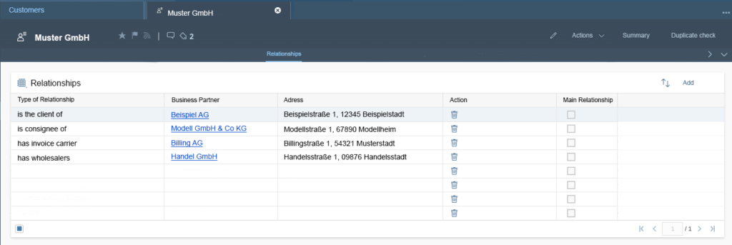 The complex relationships with all their associated data should be mapped to the standard in the SAP Sales Cloud by means of individual adaptations. This should make it possible to retrieve all associated customer data, including those of the intermediaries working for the customer. Thanks to the “relationships” level, the SAP system offers the opportunity to solve this problem without having to use another system instance. Figure 2 shows how such a network of relationships can be mapped.