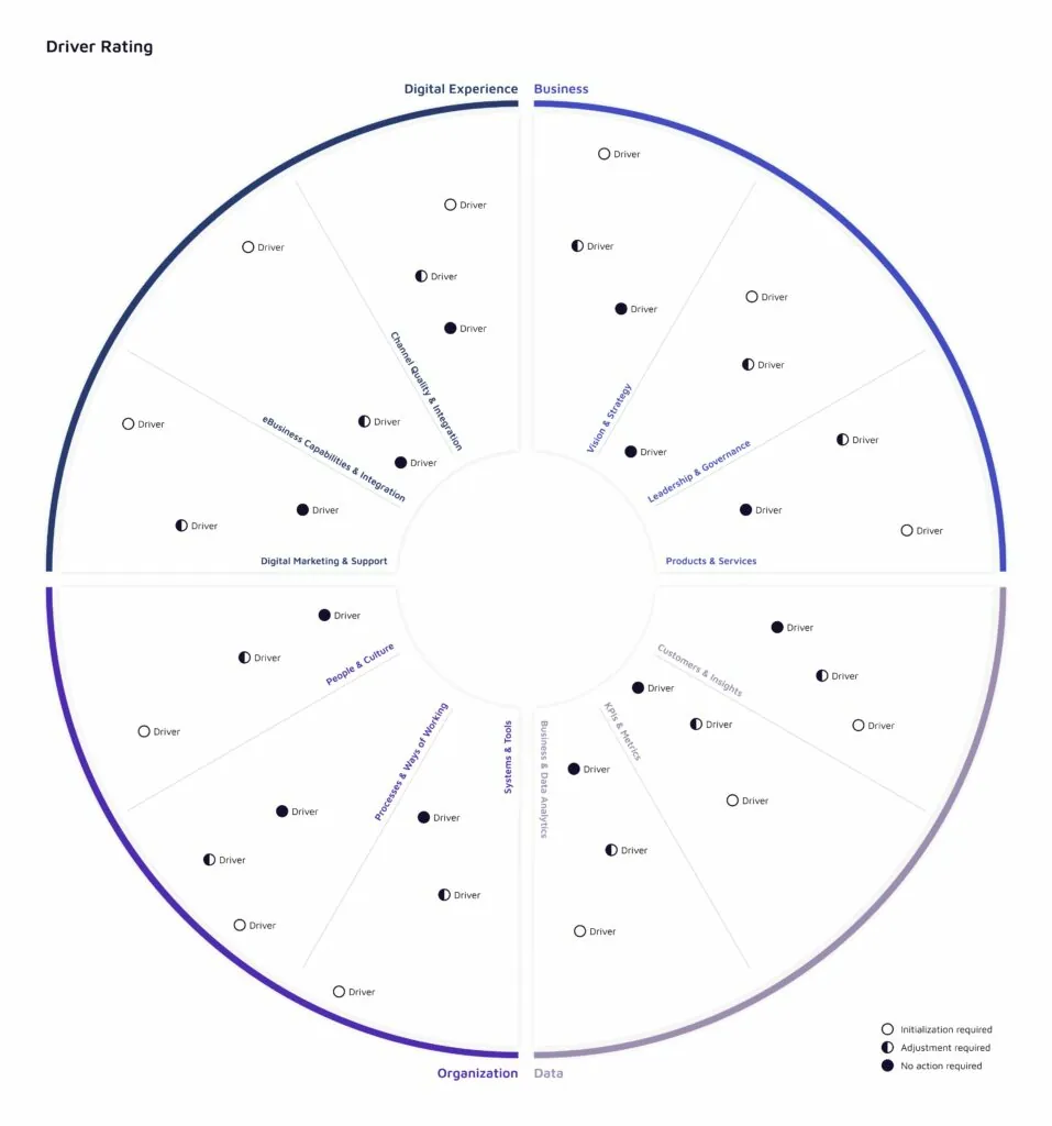 During the maturity assessment, these drivers will be initially examined from a subject-specific perspective, allowing us to gain insight into the company’s current maturity level within each capability area. Subsequently, all these drivers can be evaluated and rated based on their urgency for action in order to attain the desired level of maturity.