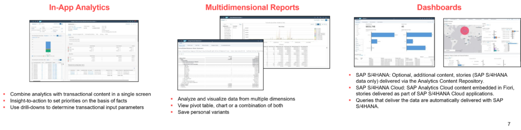 SAP S/4HANA embedded analytics comes with a wide range of predefined business content in the form of KPIs, reports, queries, predictive scenarios, planning scenarios and more, providing a solid foundation for transactional reporting in S/4HANA that can be combined integratively with other SAP products, such as SAP BW/4HANA and SAC.