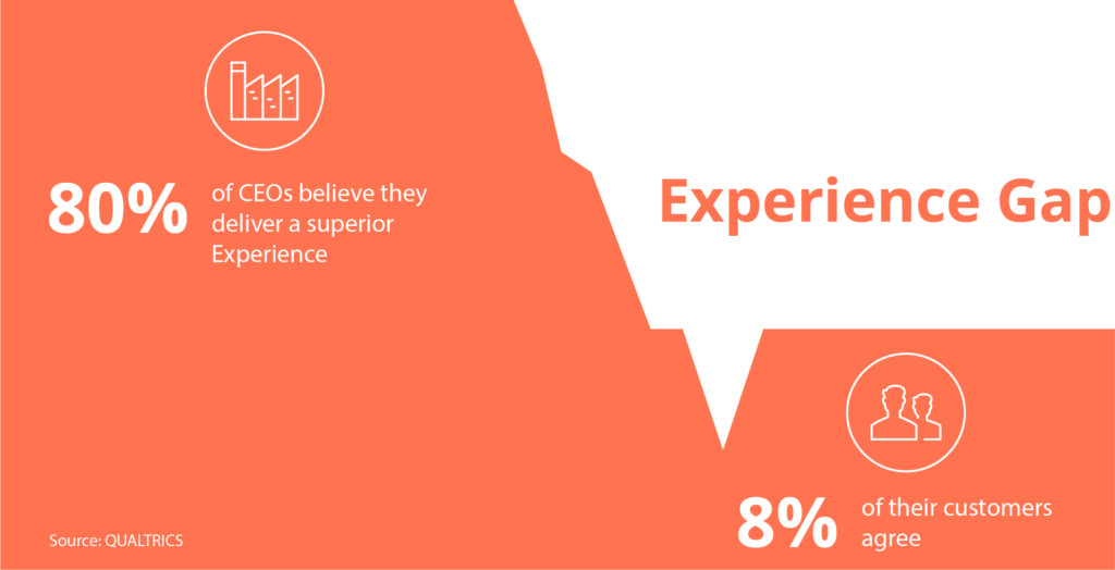 How good is your customer experience management? The company Qualtrics determined in a survey that 80% of the CEOs surveyed think that they offer a sufficient customer experience; however, only 8% of customers indicated that they are satisfied with the experience. This misjudgment is the experience gap – and it shows how far apart the promise of providing a perfect customer experience and the actual customer experience lie. Companies should try to provide their customers with everything the brand promises. Only this way can they ensure that they are fulfilling customers’ expectations on the customer journey at all times.
