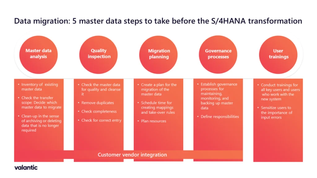 First, companies should carefully review their master data to determine which master data needs to be migrated to the new system. Data that is no longer needed takes up time and money unnecessarily and can be archived. Data cleansing is never easier and less expensive. Migration is thus the opportunity to free the company from unnecessary data.