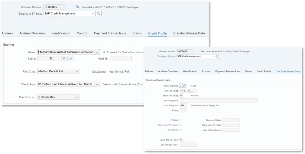 The role UKM000 can essentially be populated via two tabs to maintain the credit profile and credit standing data. This includes in particular the risk class, checking rule, credit group and scoring data. In the credit standing data, it is possible to store information on the last scoring or – for the legal department – events such as initiated insolvency proceedings; these usually originate from official sources such as the Federal Gazette.